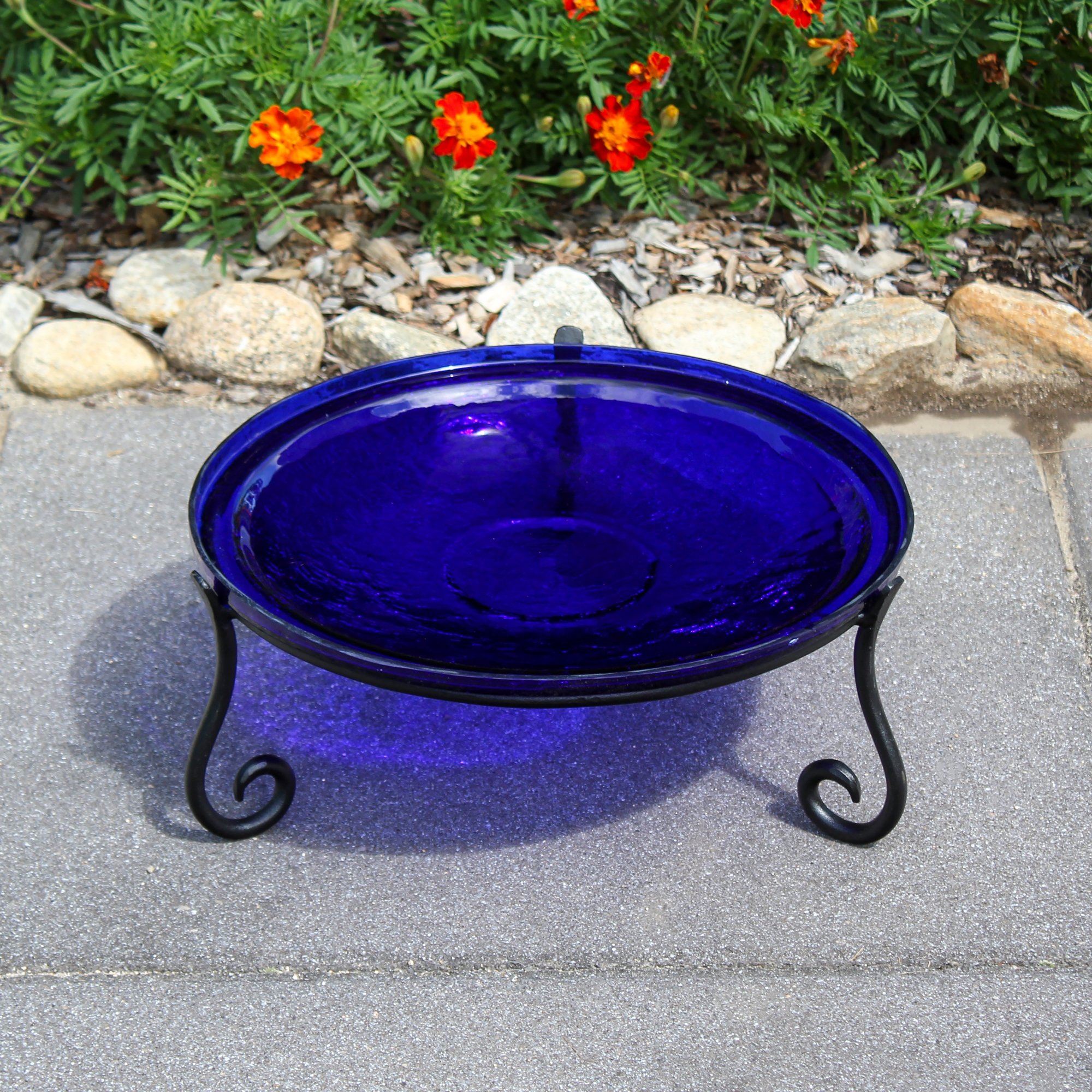 This deep Cobalt Blue Crackle Glass Bowl with a wrought iron Short Stand is striking as a low birdbath, or table centerpiece. Place it on a deck or table, a pedestal in the garden. The small three-footed wrought iron stand is perfect for rock gardens, low border plantings and tabletop decor. Fill it with floating flowers and candles for catering and garden parties.