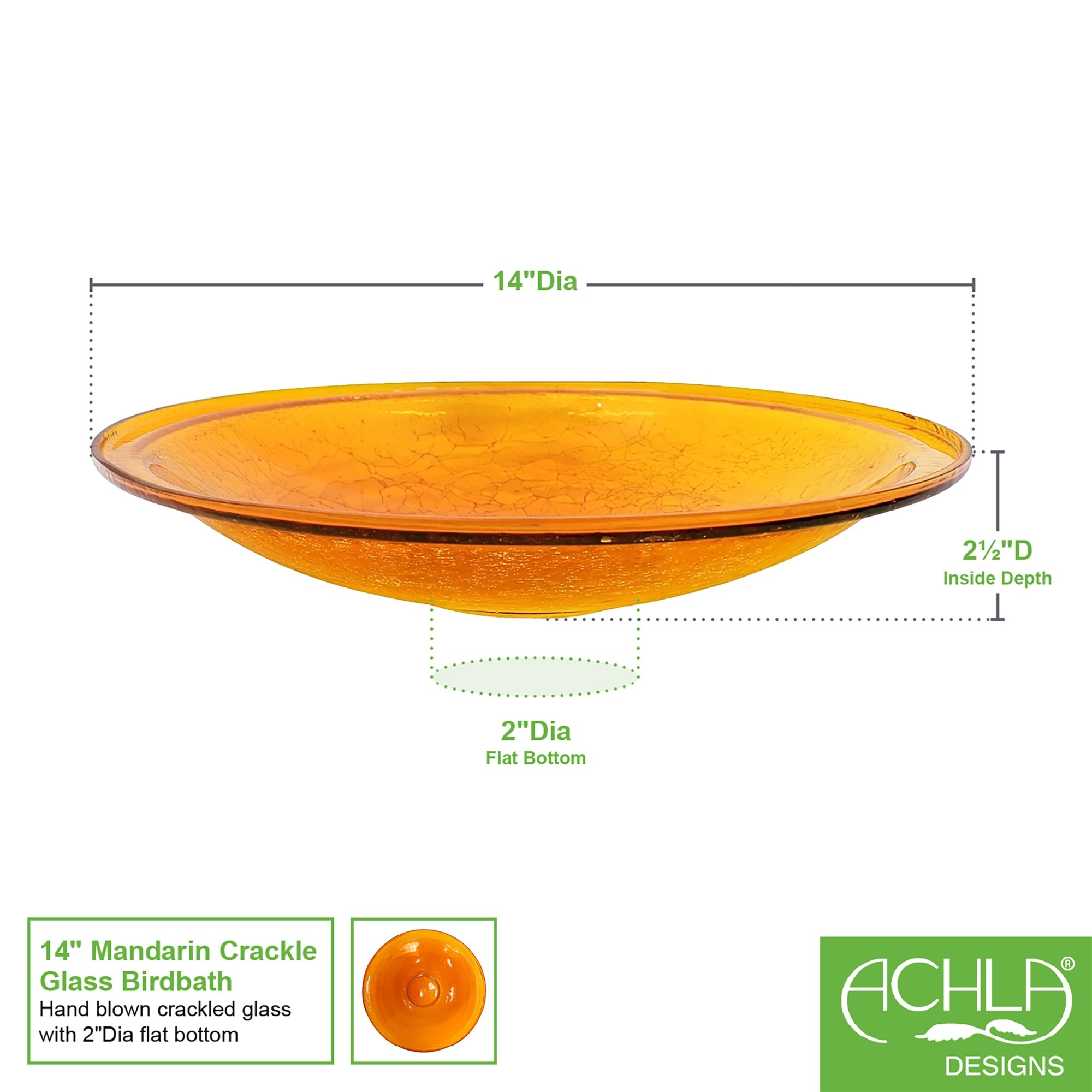 Reflective and brilliant, our Crackled Glass Birdbath Bowls are sparkling gems in the garden. Bowls are made from hand-blown glass in five vibrant colors, measuring 14” diameter x 2 ½”D. Available for purchase alone, or with our wrought iron Birdbath Hanging Ring or Cradle and Garden Stake, these colorful birdbaths create a bright pop anywhere in the garden. Birds will enjoy a safe place to cool off and drink some water, and gardeners will love having this beautiful piece to accent the plantings. These bowls are also designed to fit our wrought iron bases the Short Stand II (GBS-25)and Ring Stand (FB-14) for table top or garden. Makers of fine quality goods for the home and garden since 1994, we offer a full line of Achla Designs wrought iron landscape structures, plant supports and stands, birdbaths and other decorative garden elements for the patio, porch, deck and yard.