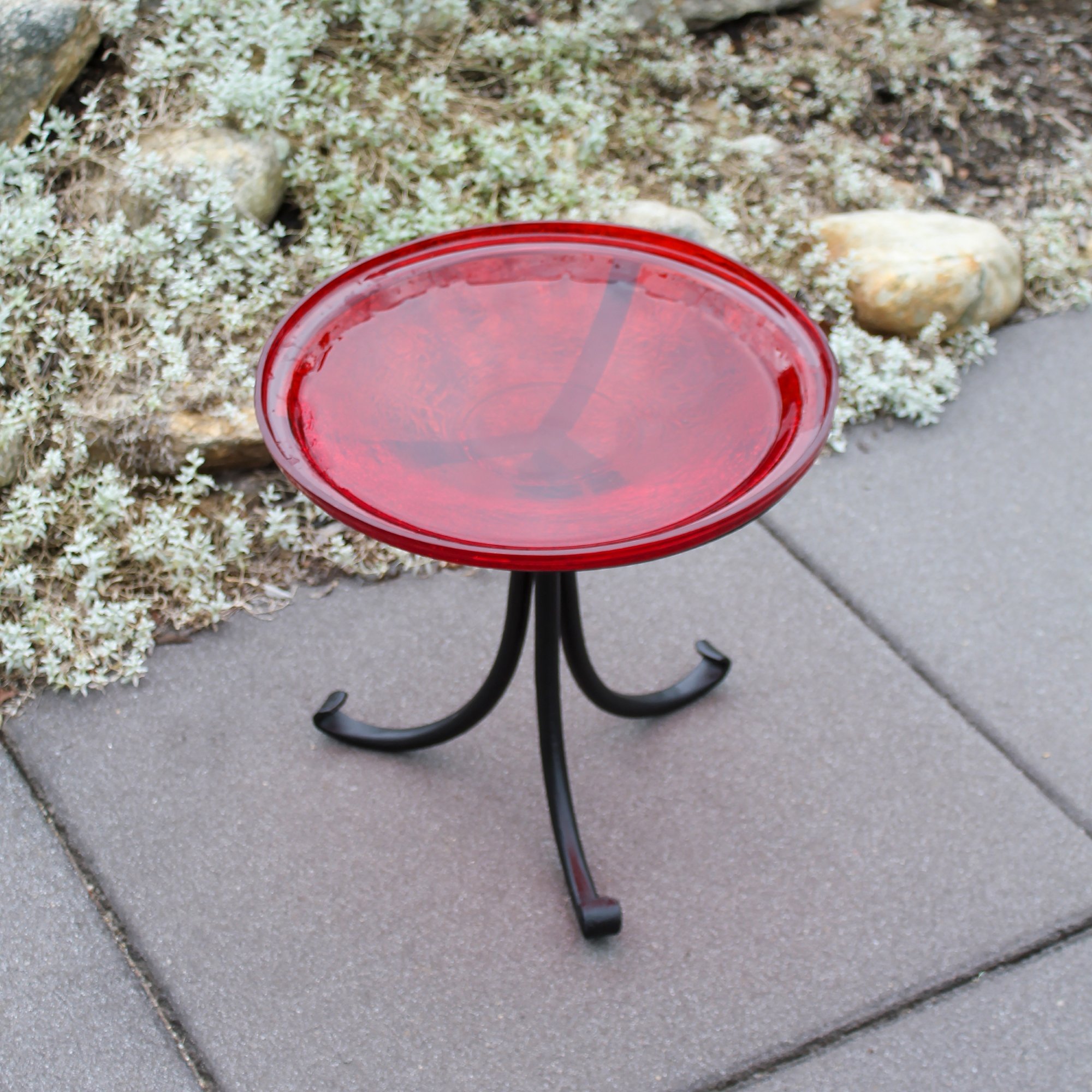 For a tabletop on the deck or a pedestal in the yard, this brilliant Red Crackle Glass Birdbath with Tripod Stand is great for attracting wildlife to an intimate garden. The hand-blown glass bowl is held safely in a metal cradle that has a threaded base. The cradle base then attaches to the small three-footed wrought iron stand. This is a perfect choice for a small rock garden or low border planting.