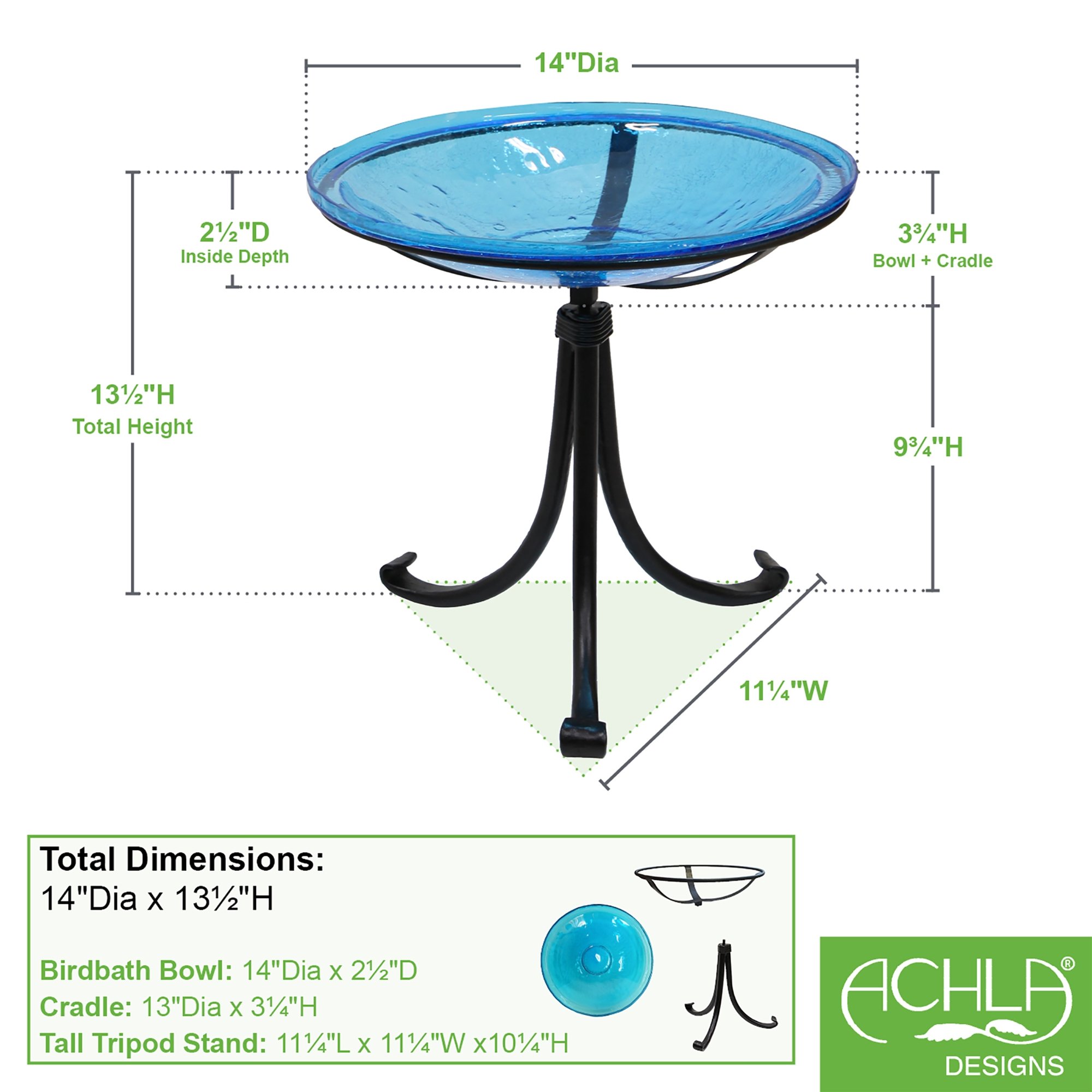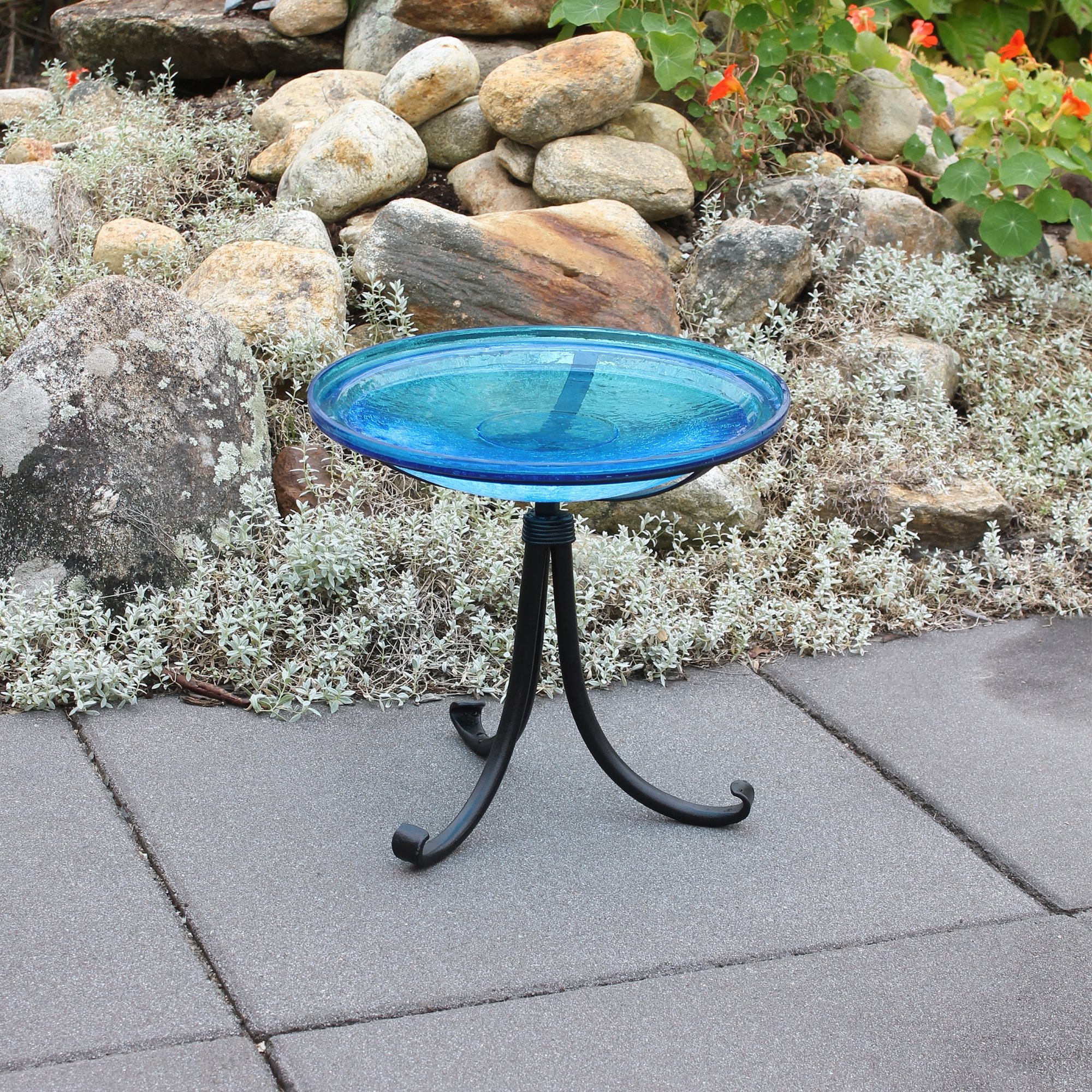 For a tabletop on the deck or a pedestal in the yard, this brilliant Teal blue Crackle Glass Birdbath with Tripod Stand is great for attracting wildlife to an intimate garden. The hand-blown glass bowl is held safely in a metal cradle that has a threaded base. The cradle base then attaches to the small three-footed wrought iron stand. This is a perfect choice for a small rock garden or low border planting.