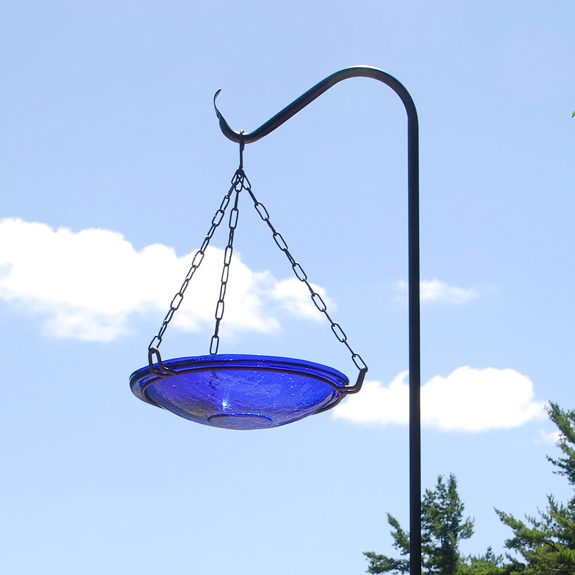 Reflective and brilliant, our Crackled Glass Birdbath Bowls are sparkling gems in the garden. Bowls are made from hand-blown glass in five vibrant colors, measuring 14” diameter x 2 ½”D. Available with our wrought iron Birdbath Hanging Ring, these colorful birdbaths create a bright pop anywhere in the yard, hung from one of our Achla Designs wrought iron hanging hooks or brackets. Birds will enjoy a safe place to cool off and drink some water, and gardeners will love having this beautiful piece to accent plantings, in the garden or on a deck, porch, or fencepost.