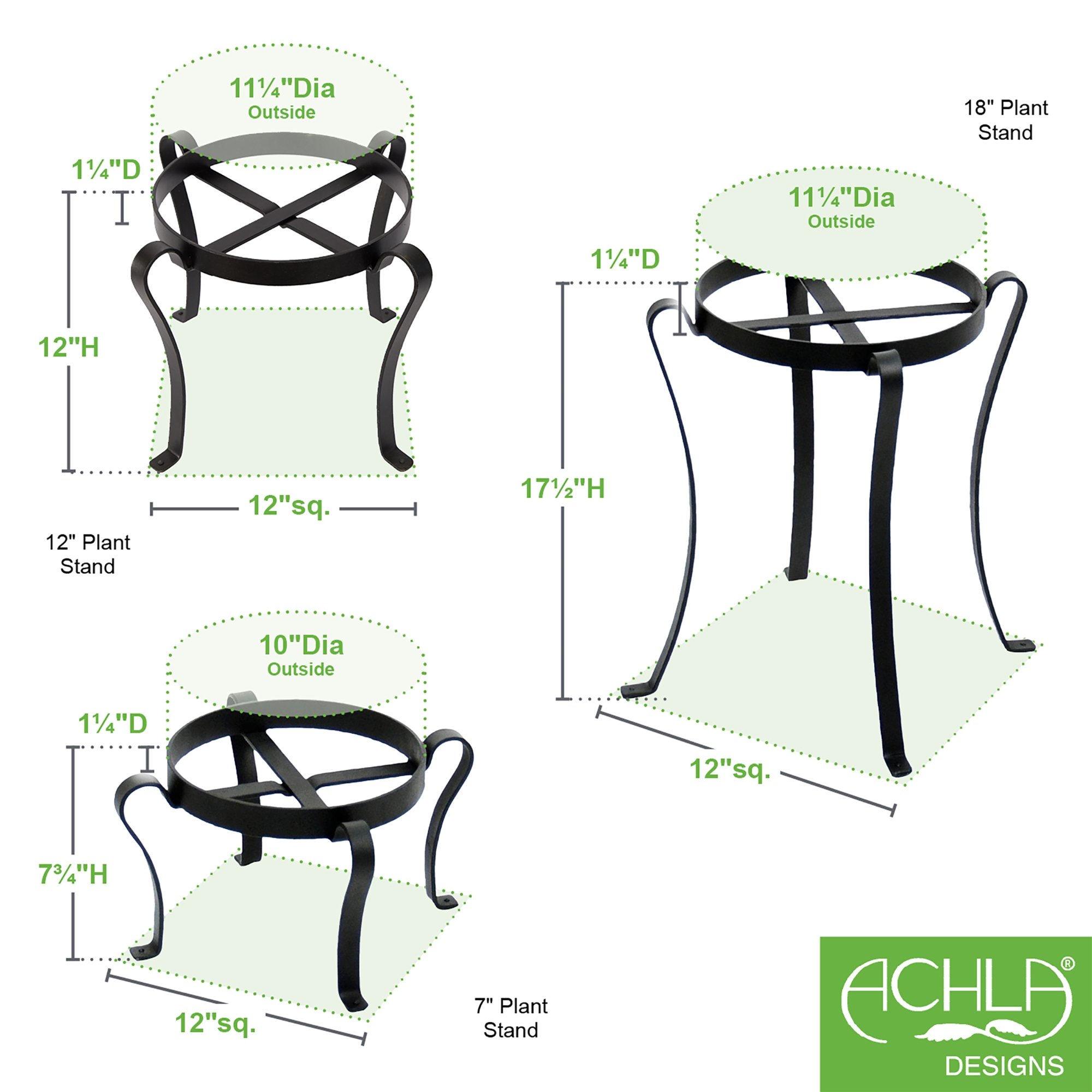 Our Achla Designs Patio Plant Stands make an excellent addition to any home, patio, balcony, porch, terrace, or garden. They have gracefully arching legs, curled feet, and a sturdy construction that can support a variety of potted plants and other round containers. The top of the stand is circular and has two metal cross bars on which you can place a flowerpot or a planter and also features a short rim that prevents the pot from sliding off. These stands are available in three different sizes, making it easy for you to find one that fits your particular needs. The smallest stand is 7.5 inches tall, and the upper rim has diameter of 10 inches. The mid-sized stand is 11.75 inches tall and has a diameter of 11.75 inches. The largest stand is 17.75 inches tall and has a diameter of 11.75 inches. Because these plant stands are handmade, the exact dimensions of each may vary slightly. The stands are hand forged from wrought iron and have a high-quality black powder coated finish. Powder coating is a process that results in a much more durable and scratch-resistant finish than regular liquid paint. The sleek black finish gives the stand a touch of modernity, but it is neutral enough to look great anywhere. The stand looks fantastic in both indoor and outdoor settings. Indoors, the decorative plant stand can be placed in the corner of any room or entryway. Outdoors, the plant stand will look great on your patio or in your garden. Our family-owned business was started in 1977 with Minuteman International, making accessories for fireplaces and wood stoves. In 1994 we launched Achla Designs, introducing wrought-iron pieces for the home and garden. We take pride in our products, and all of our plant stands have a 90-day manufacturer’s warranty.