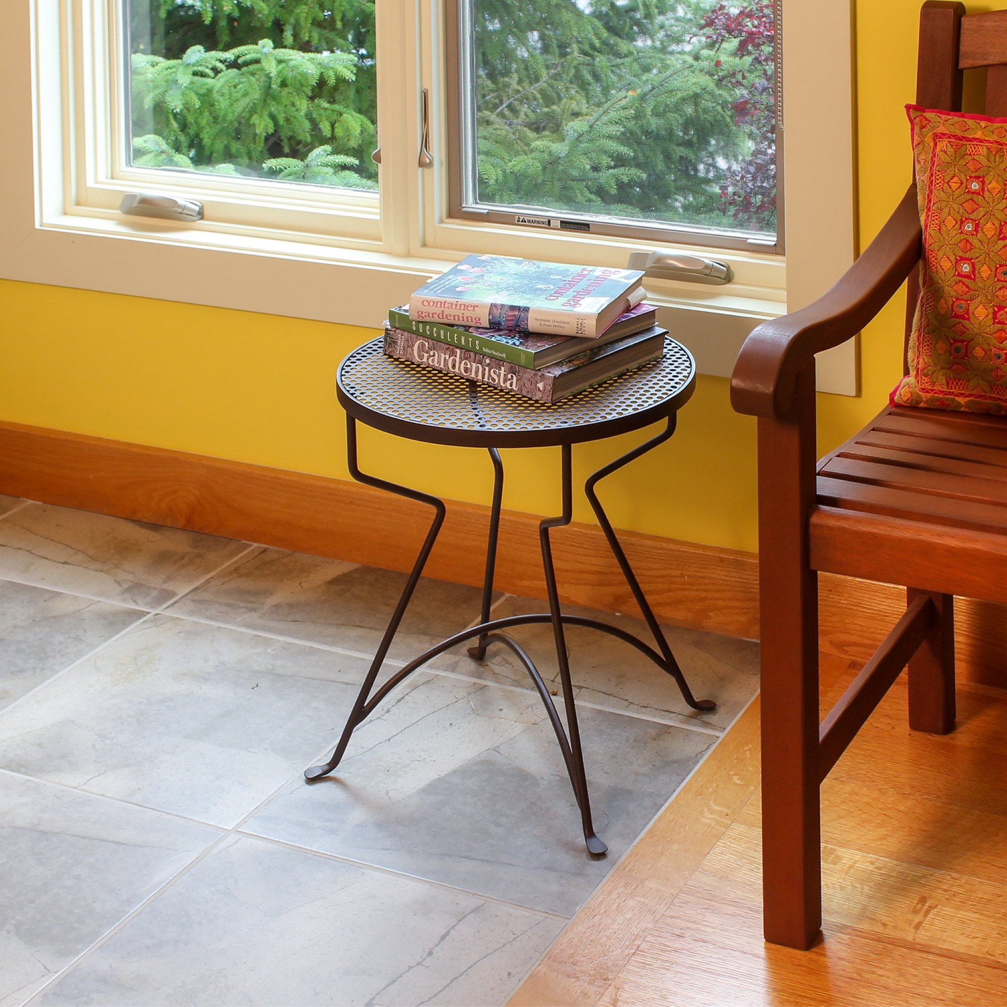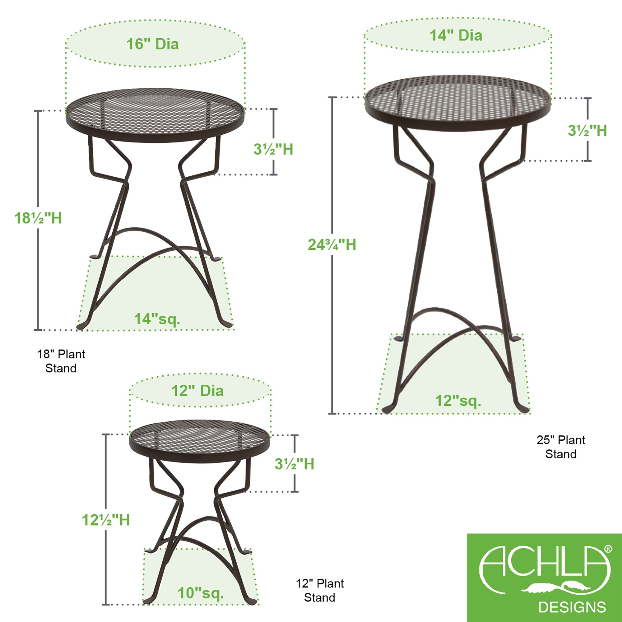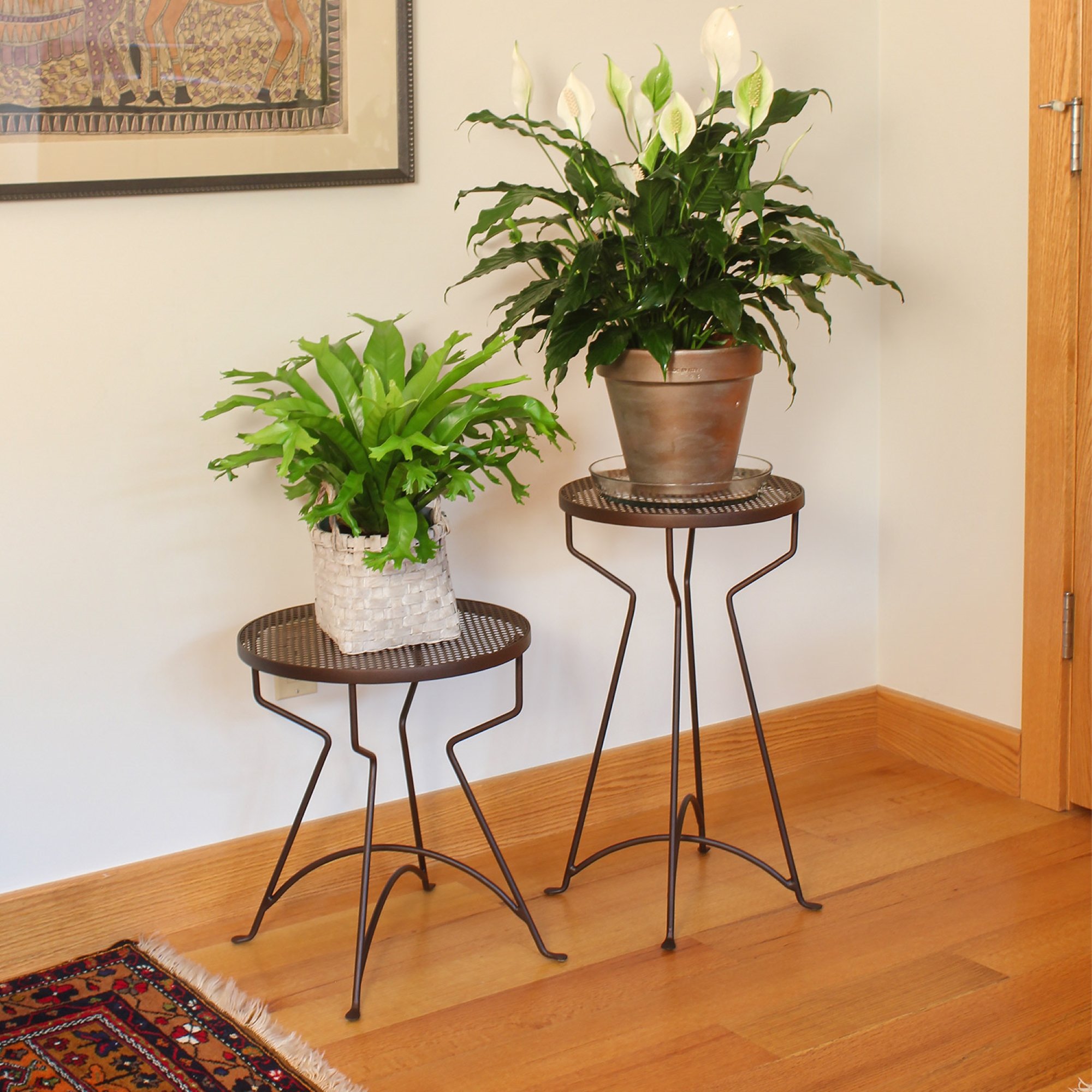 These breezy Capri Plant Stands do double-duty as side tables on a patio, balcony, or lanai. Create a tiered arrangement for container plants and use one for a cold drink alongside the chaise. With perforated dotted tops, these stands have the retro vibe of a vacation resort, ready for potted palm or cocktail hour. Wrought iron with Roman Bronze finish, in three sizes.