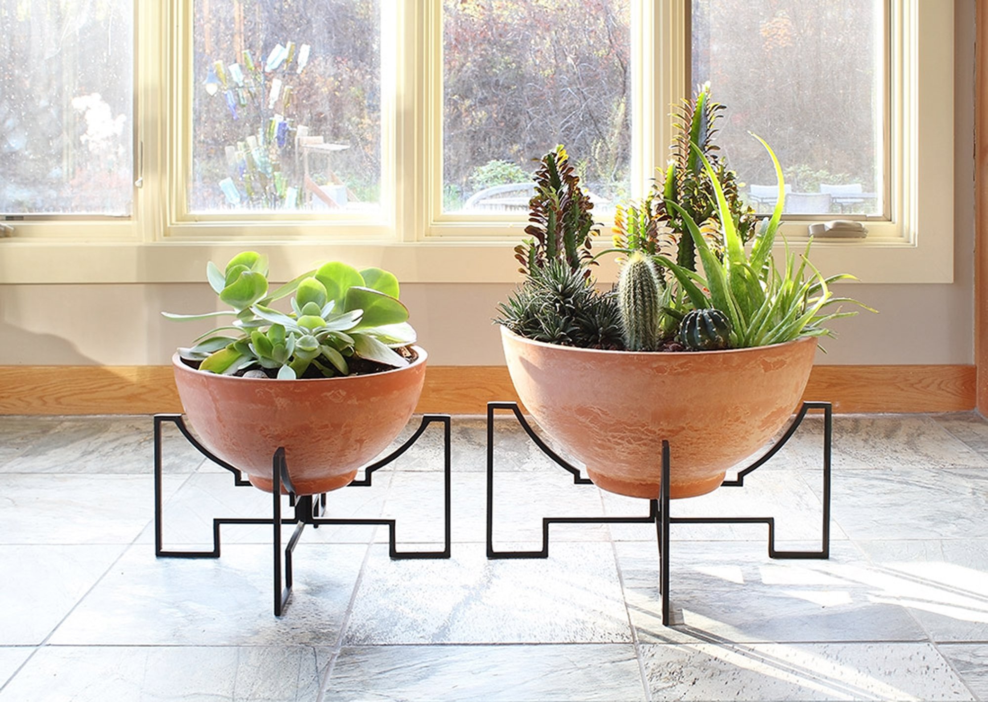 Airy and sculptural, the Jane Plant Stands consist of two pieces that slip together forming a strong crisscross support for any low wide planting container. The black, square-stock bases are perfect for a sculptural array of succulents or cactus garden, for a mid-century patio, terrace or sunroom. In two sizes, the low wide planters offer many possibilities for creativity. Add the container of your choice, as a stylish holiday tree stand, fairy garden or fountain. All of our Solaria Collection plant stands are made of wrought iron with a Black powder coated finish, designed for indoor and outdoor use, with materials and finishes for maximum weather resistance.