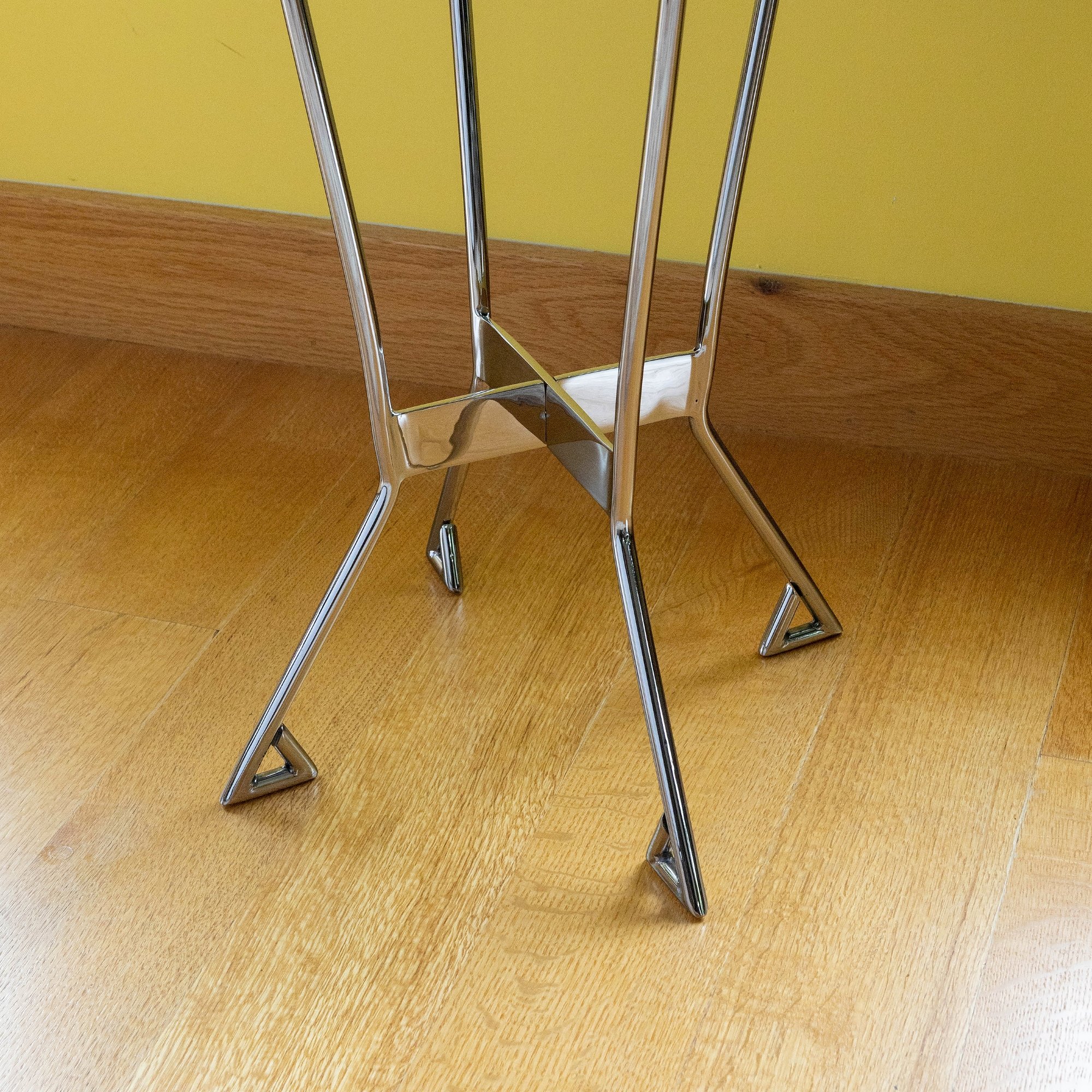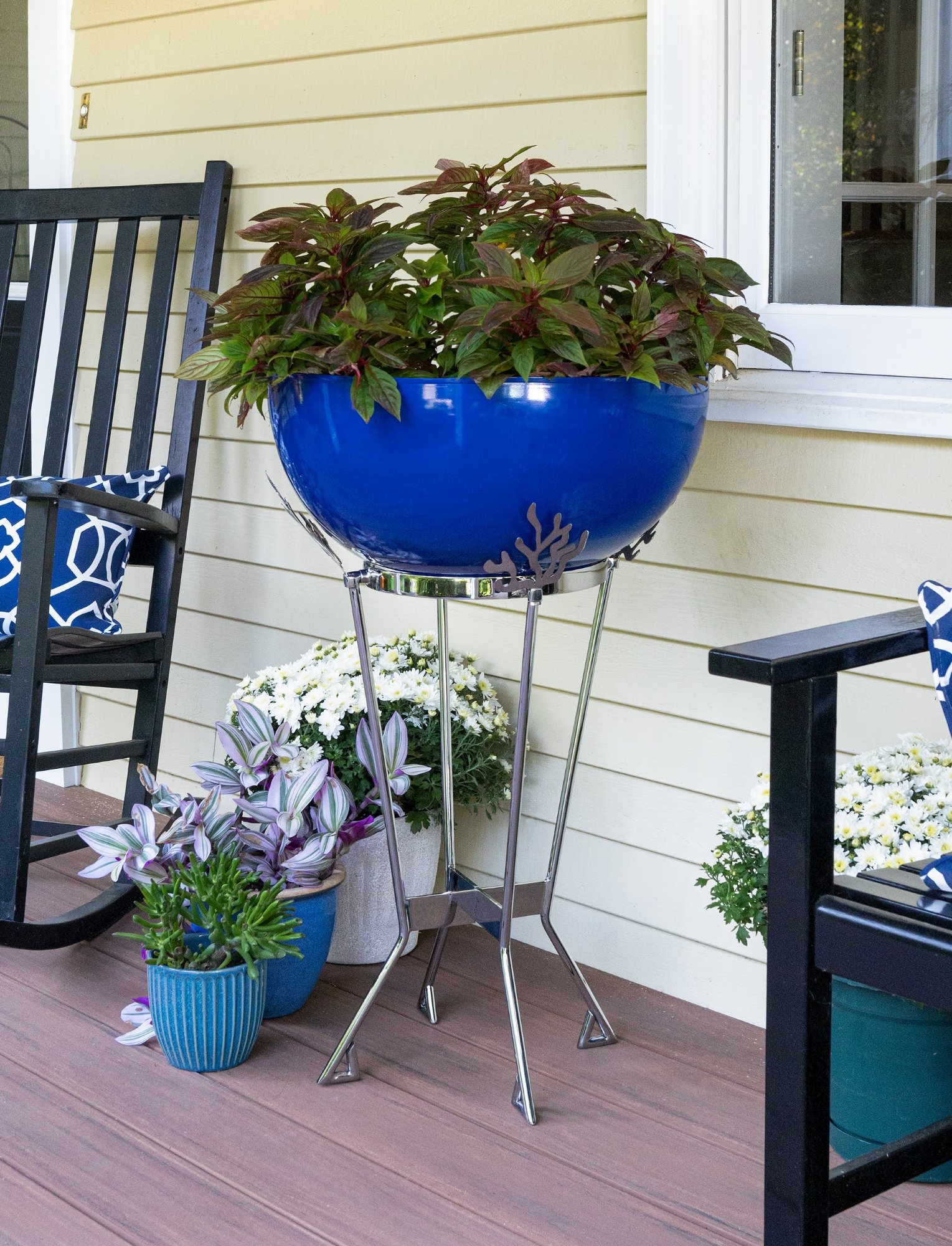 In shiny stainless steel with a pop of color, the Kazuyo Planter is a statement piece for creative decorating with plants. In a combination of geometric and natural elements, the planter features an angular base with coral accent details that gently cradle the curvaceous planter. The wide geometric planting bowl is made of galvanized steel and finished in a brilliant glossy blue powdercoating. Use it for a dramatic display of cascading plants, orchids, or a sculptural floral arrangement.