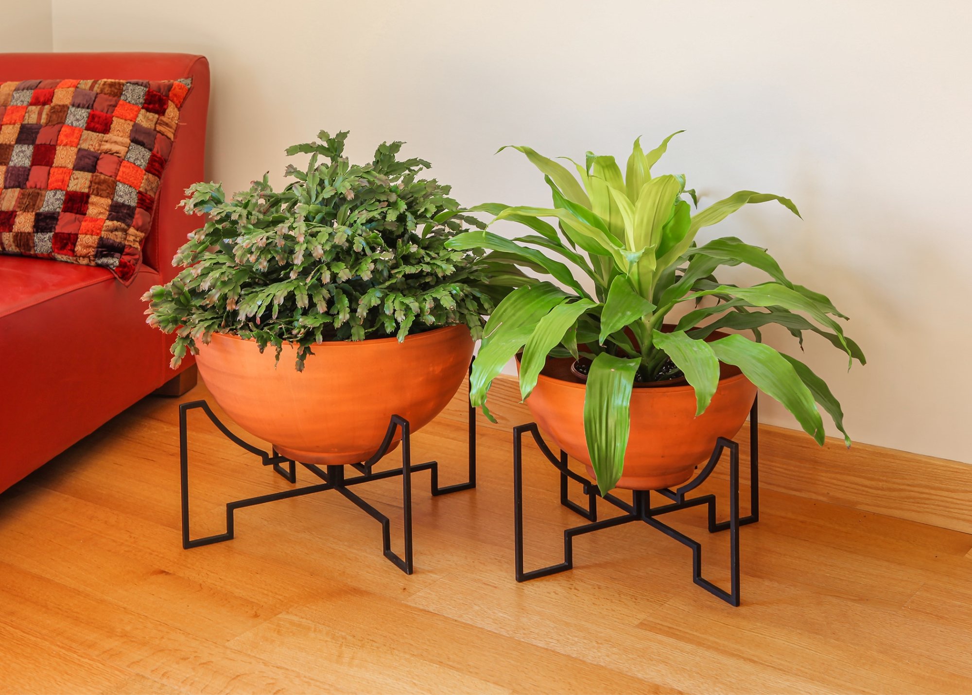 Airy and sculptural, the Jane Planters have bases made from two pieces that slip together forming a strong crisscross support for low, wide planting bowls. The black, square-stock bases are in bold contrast to the smooth round bowls, perfect for creating a sculptural array of succulents or cactus garden, for a mid-century patio, terrace or sunroom. In two sizes, the low wide planters offer many possibilities for creativity, as a stylish holiday tree stand, fairy garden or fountain. Jane Planter stands are made of wrought iron with a Black powder coated finish, with planting pots made from galvanized steel with a warm Burnt Sienna patina finish, or a bold French Blue powder coating. All of our Solaria Collection plant stands and hangers are designed for indoor and outdoor use, with materials and finishes for maximum weather resistance.