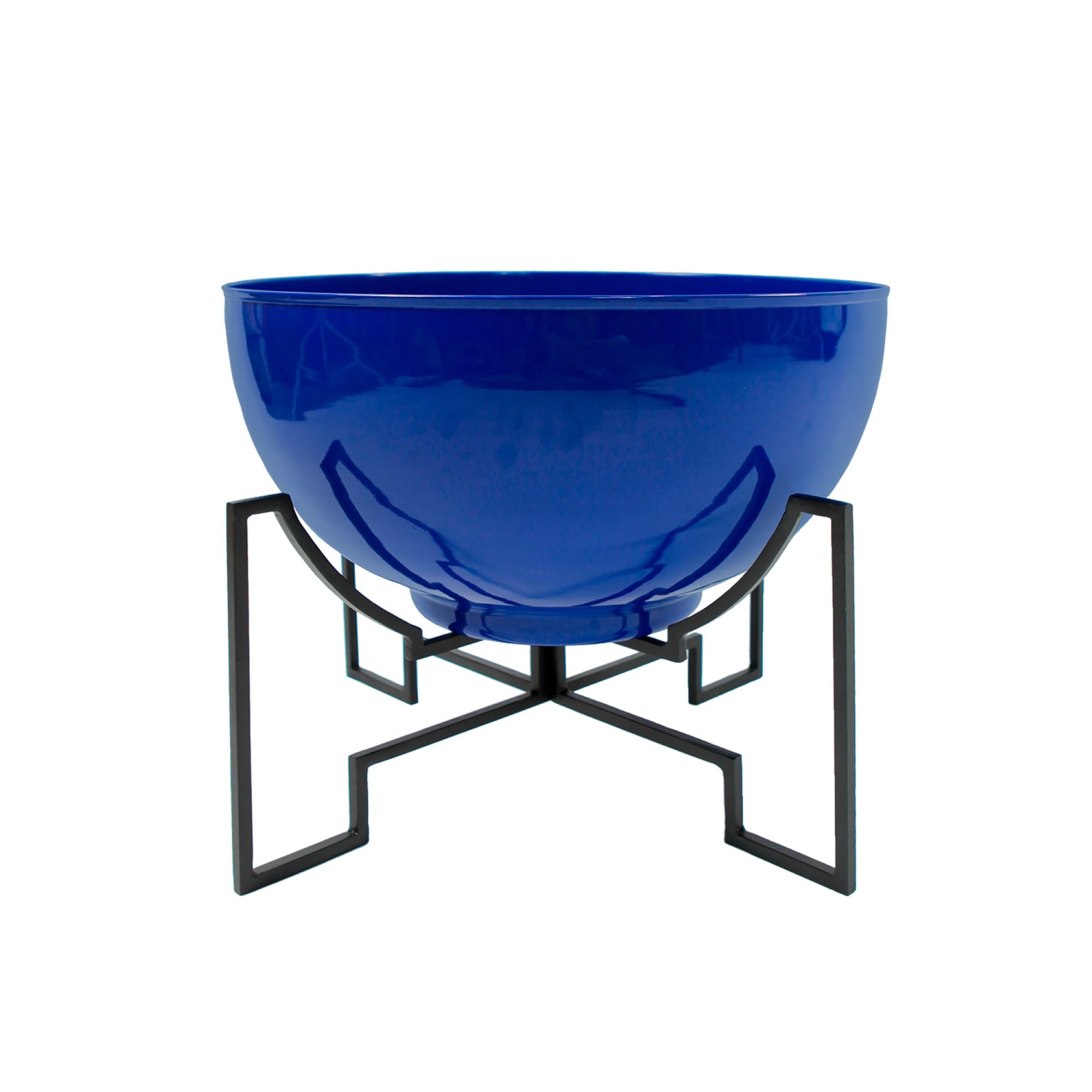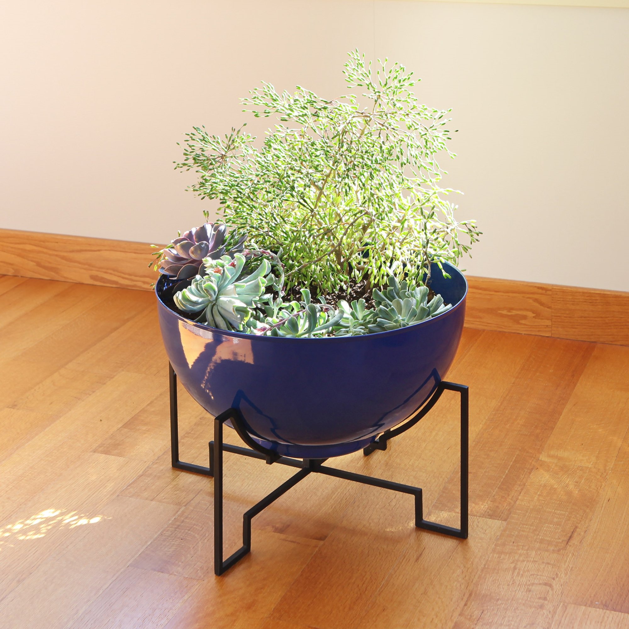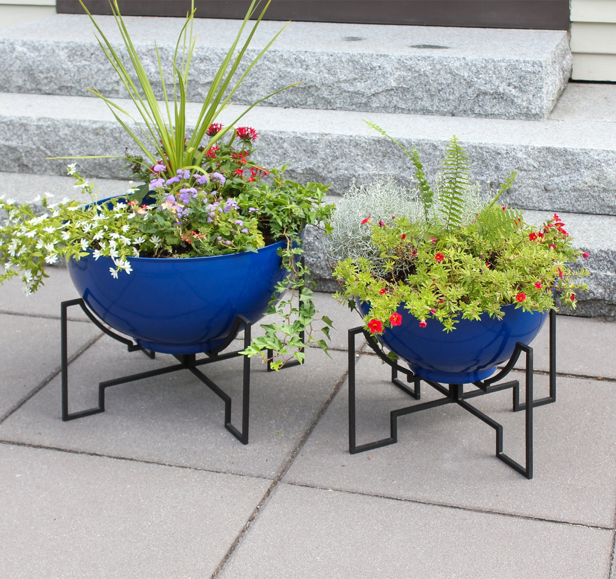 Airy and sculptural, the Jane Planters have bases made from two pieces that slip together forming a strong crisscross support for low, wide planting bowls. The black, square-stock bases are in bold contrast to the smooth round bowls, perfect for creating a sculptural array of succulents or cactus garden, for a mid-century patio, terrace or sunroom. In two sizes, the low wide planters offer many possibilities for creativity, as a stylish holiday tree stand, fairy garden or fountain. Jane Planter stands are made of wrought iron with a Black powder coated finish, with planting pots made from galvanized steel with a warm Burnt Sienna patina finish, or a bold French Blue powder coating. All of our Solaria Collection plant stands and hangers are designed for indoor and outdoor use, with materials and finishes for maximum weather resistance.