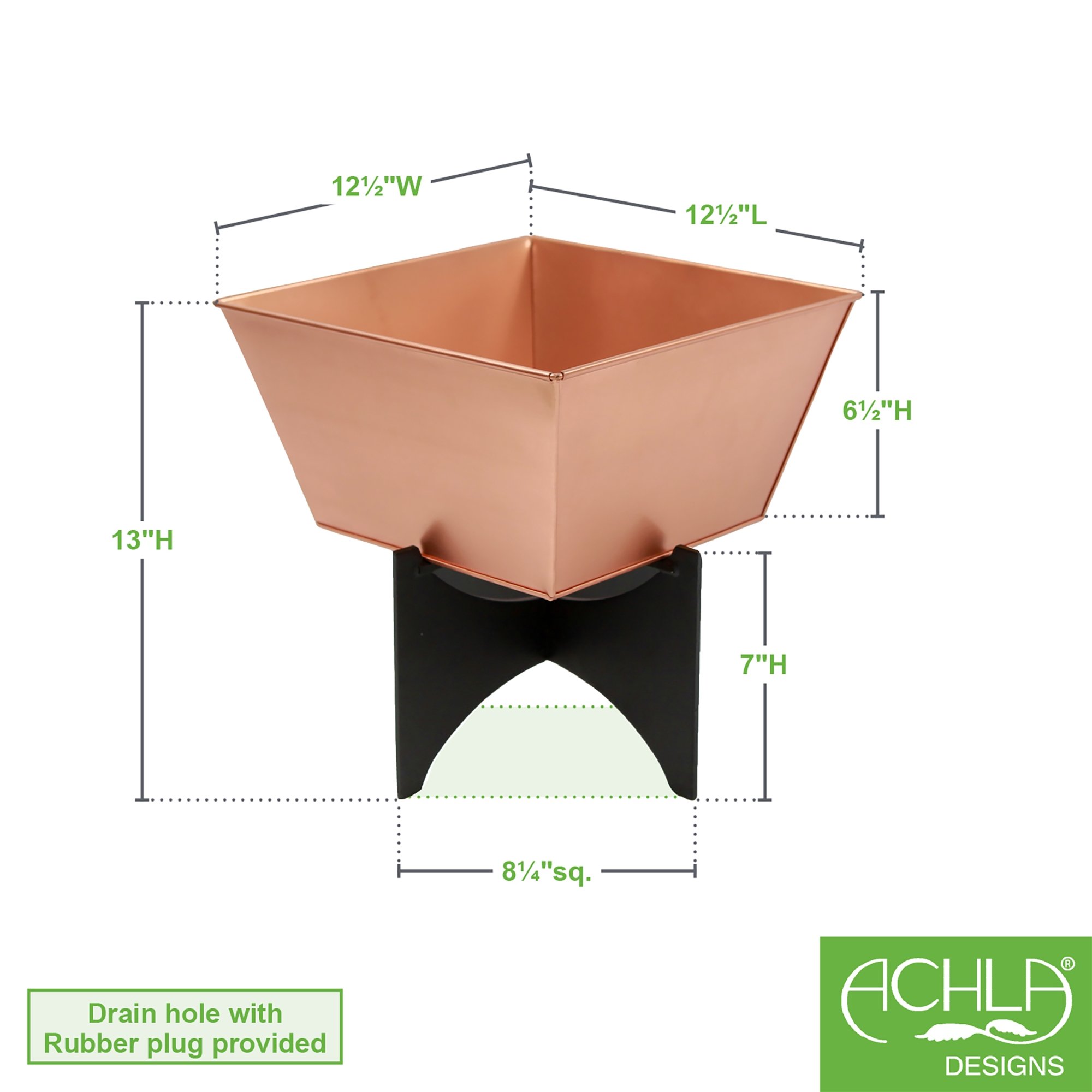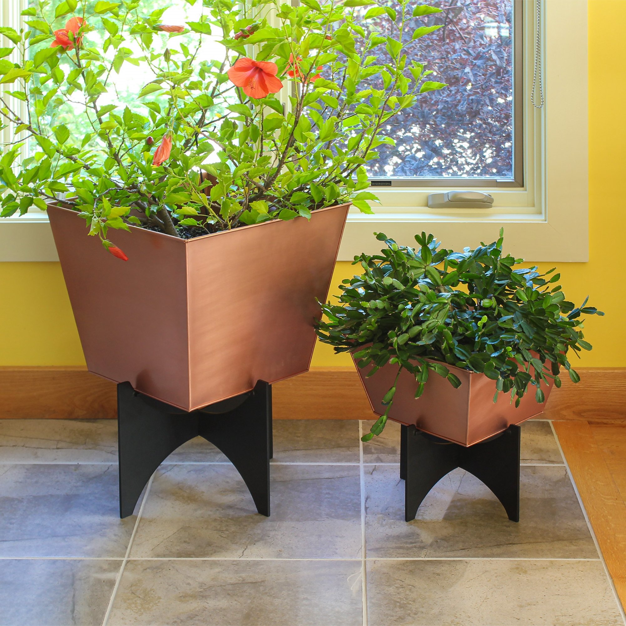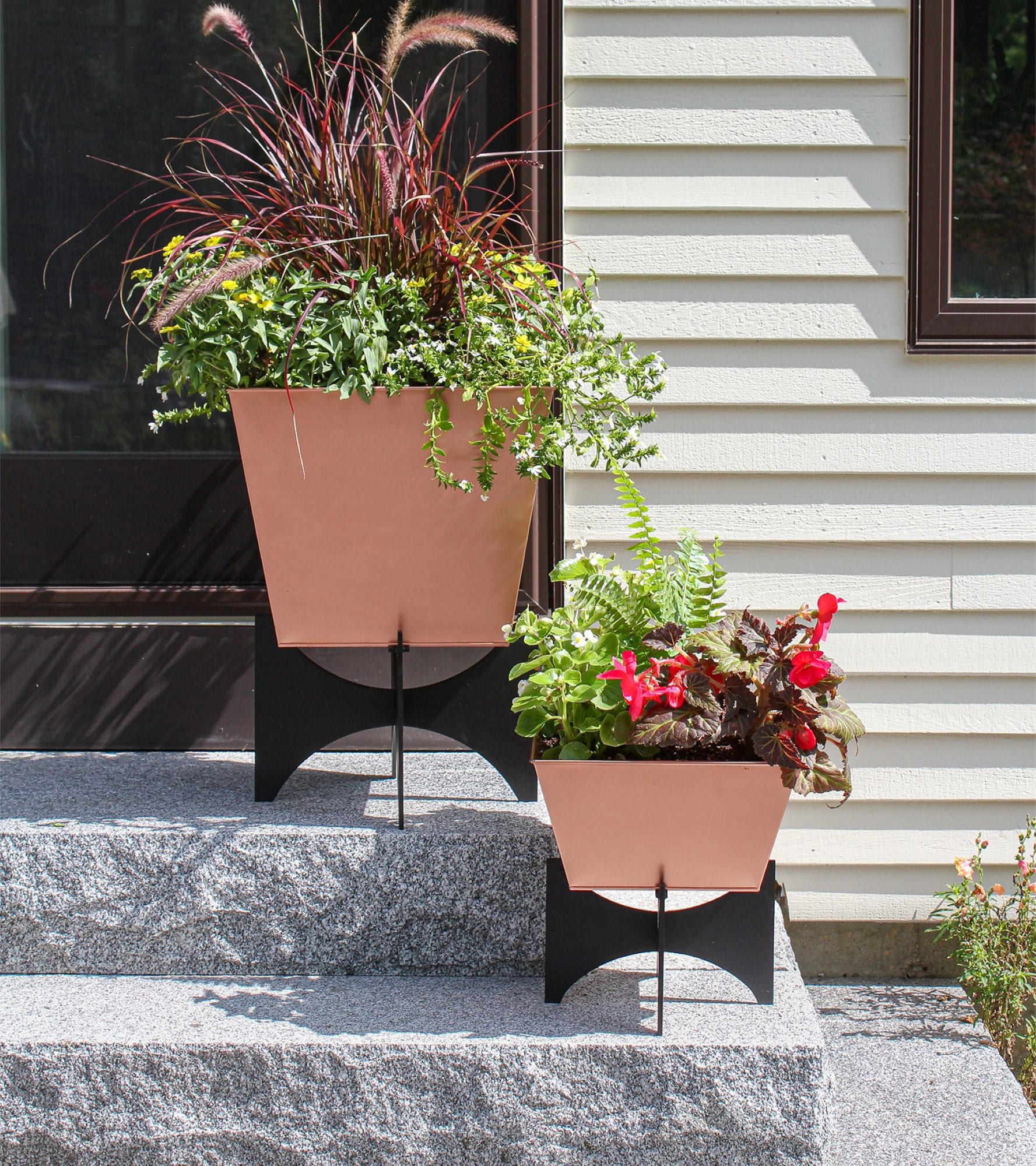 The clean curves of the Zaha Planters set off the square tapered planter above, emphasizing the sculptural profile. In two size options, these minimalist stands are ideal for statuesque bonsai or cactus, small citrus trees, even succulents, in an Asian-inspired or modern garden. Zaha Planter stands are made of two thick steel plate sections that slip together to form a strong crosspiece supporting the planting container, and finished with a Black powder coating. Planting pots are made from galvanized steel with a warm copper plated finish. All of our Solaria Collection plant stands and hangers are designed for indoor and outdoor use, with materials and finishes for maximum weather resistance.
