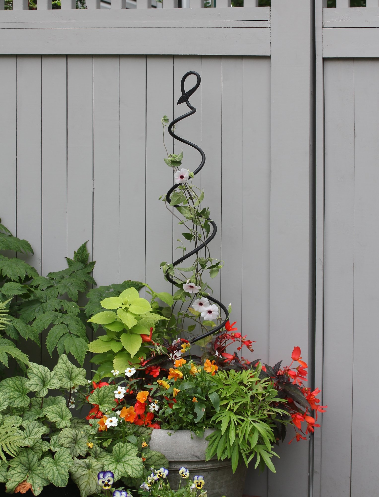 Beautiful plants are healthy plants, and sometimes they may need some support and protection when they are getting established. Staking and trellising are vital gardening tools for gardeners. Achla Designs has plant supports in many sizes and styles, for container and in-ground gardening needs. With sturdy construction and quality that will last for many seasons, the Spiral Trellis is great for supporting perennial plants like ivy, philodendron or other compact climbers. The top is finished with a leaf and this trellis has a stabilizing cross-piece at the bottom to keep it from toppling over once spiked into the ground or large container.