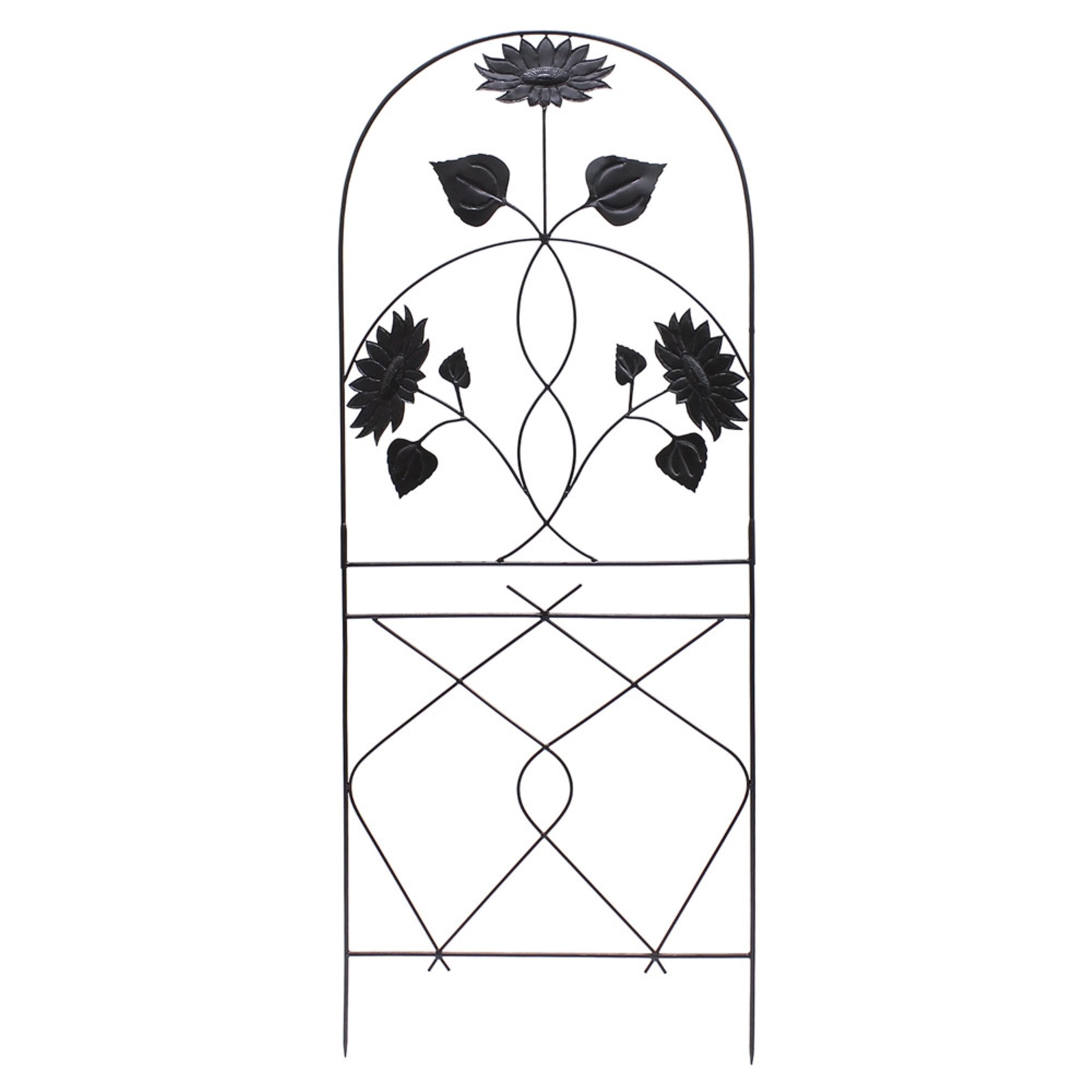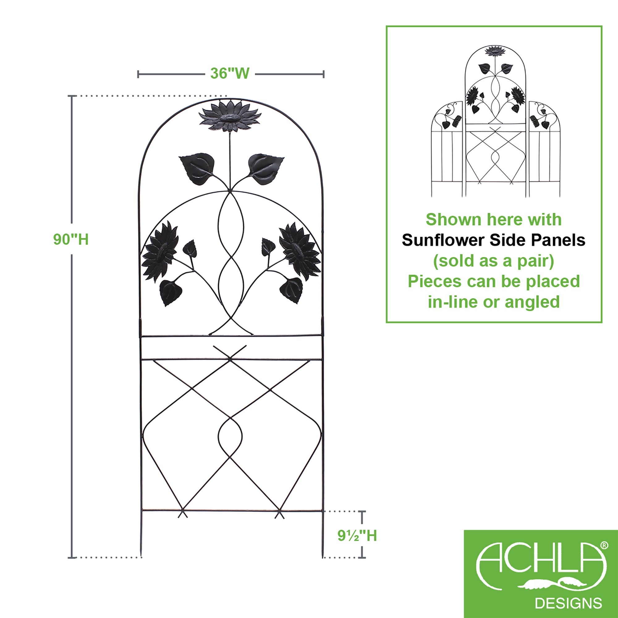 A native species to our continent, the Sunflower is the most quintessential of American garden flowers. It was first domesticated by the native people of Arizona and New Mexico who cultivated it for use as food, textile dye, building material and medicine. Spanish explorers then took the seed to Europe where it thrives today, a ubiquitous feature of garden and agriculture alike. The Sunflowers Trellis celebrates this glorious flower, in a large-scale arched center trellis and smaller optional side units. Many people choose traditional wrought iron trellises and arbors for their combination of strength and graceful style. With the Aldrich Trellises by ACHLA Designs, you get not only the functionality of a sturdy plant support, but also the artistic beauty of an elegant wrought iron structure. Side trellises can be placed in line to create a screen, or at an angle to form a niche or garden vignette. Once staked into the ground, the trellis can be additionally supported with wall brackets.