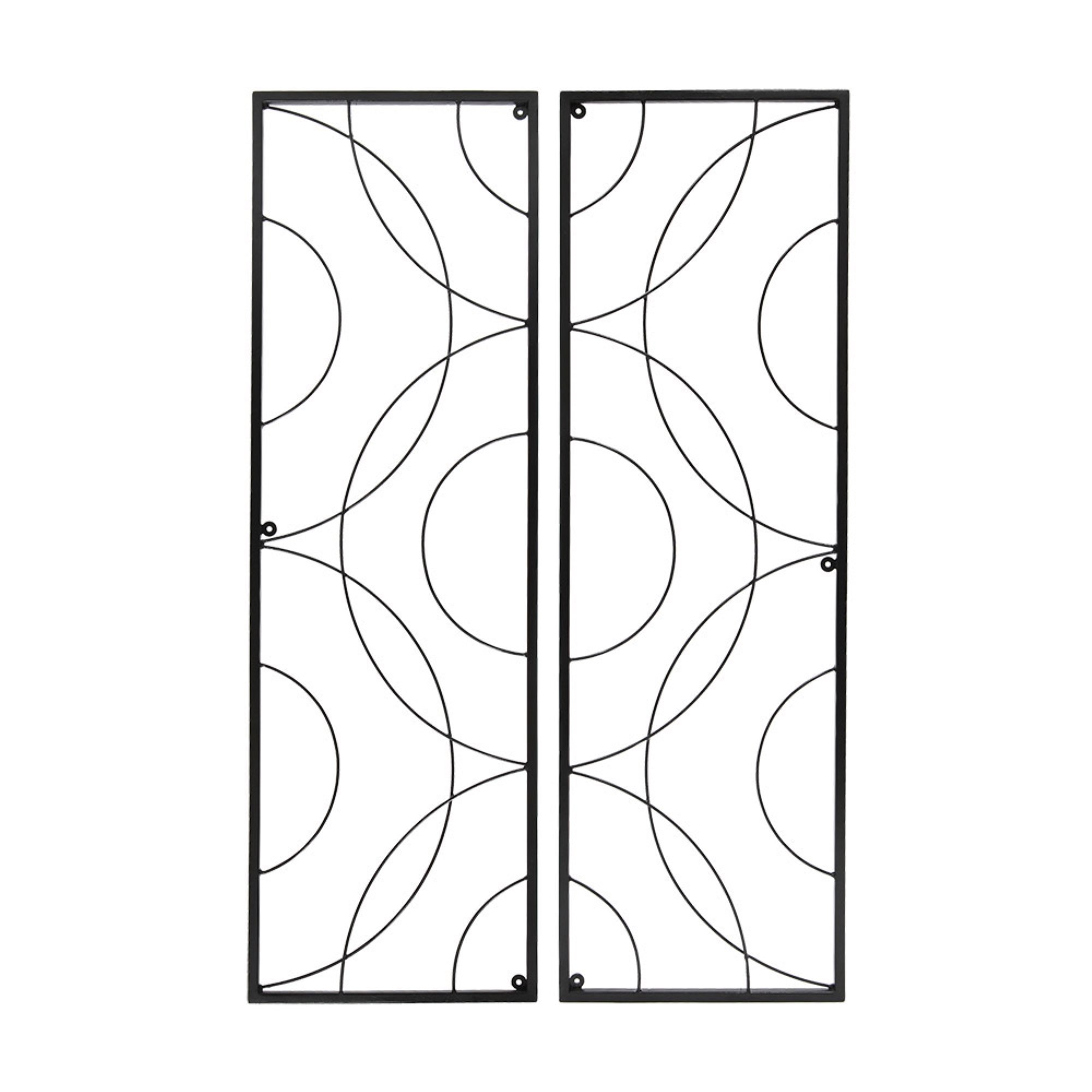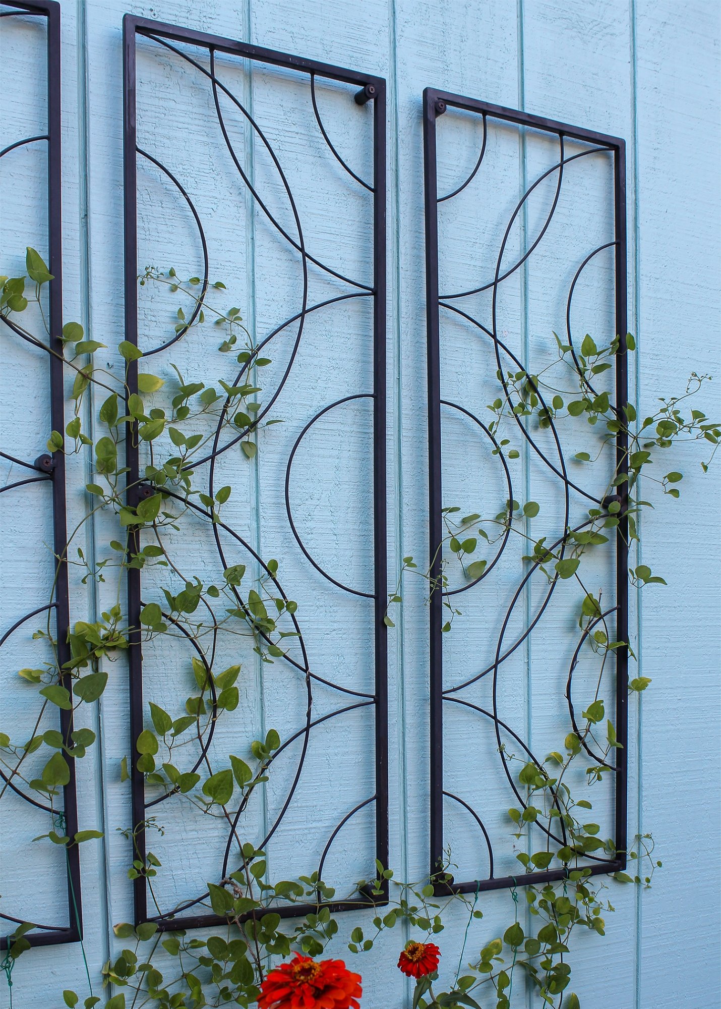 The Corona Trellis is a sturdy wall-mounted modular trellis with a light, open design of concentric circles. Trellis units can be mounted vertically or horizontally, with additional units added to form a continuous pattern. Made of wrought iron with ample elements for supporting clematis, climbing roses or annual vines. Sold in a set of two, with mounting tabs provided for each piece. Finished with a black powder coating for maximum weather resistance.