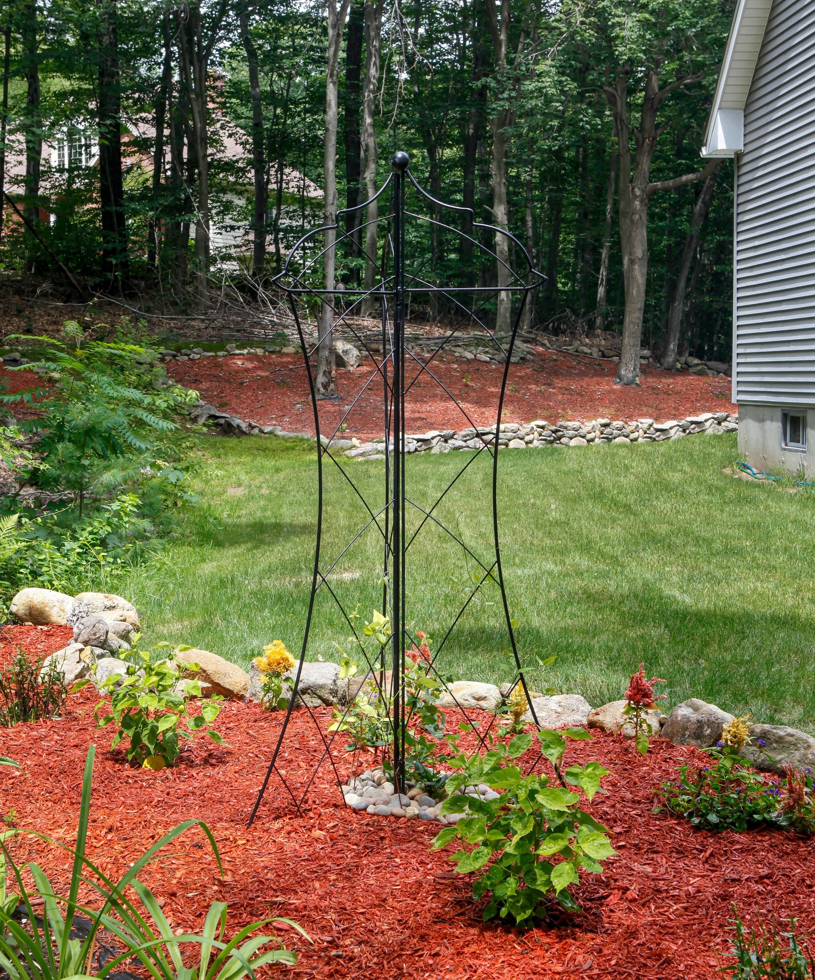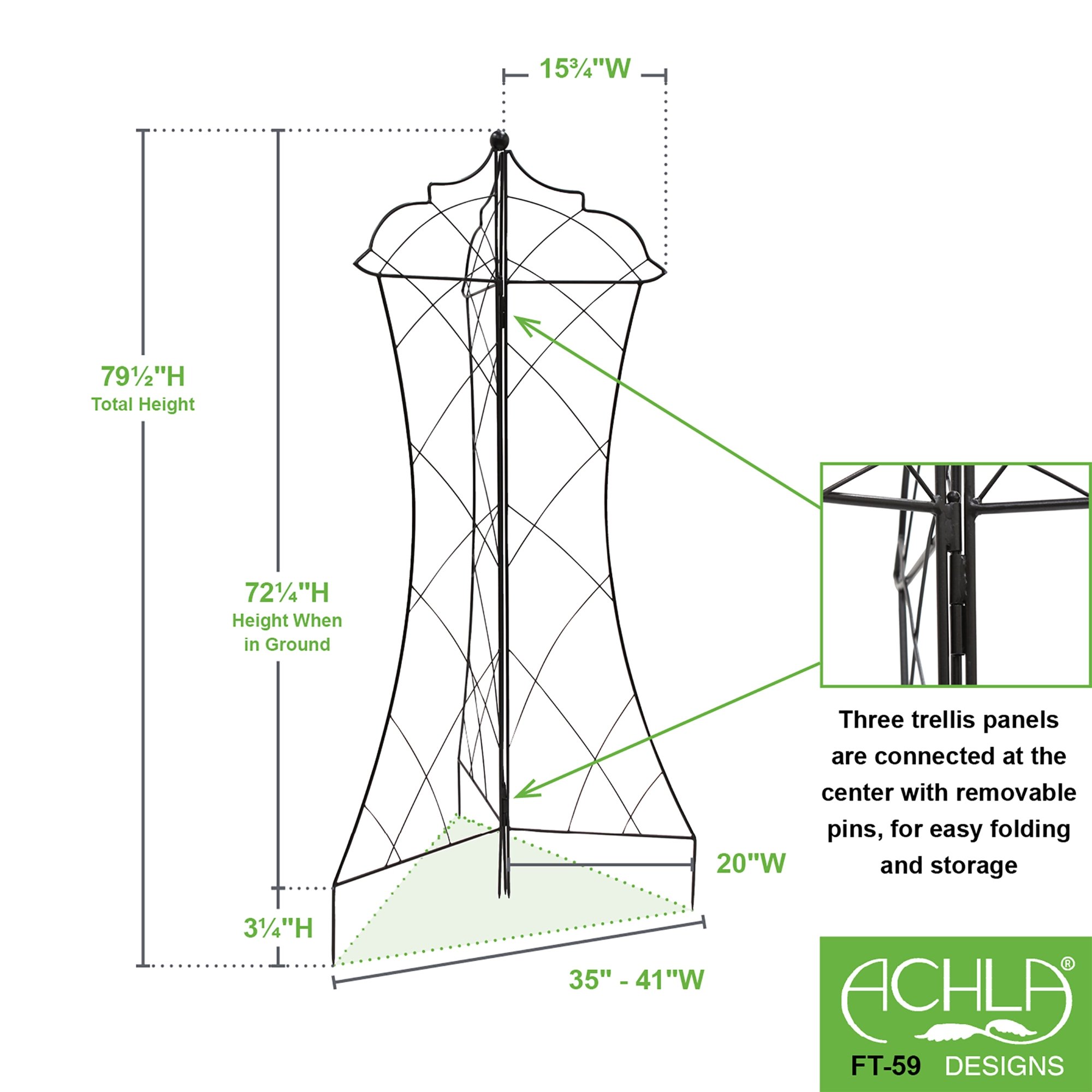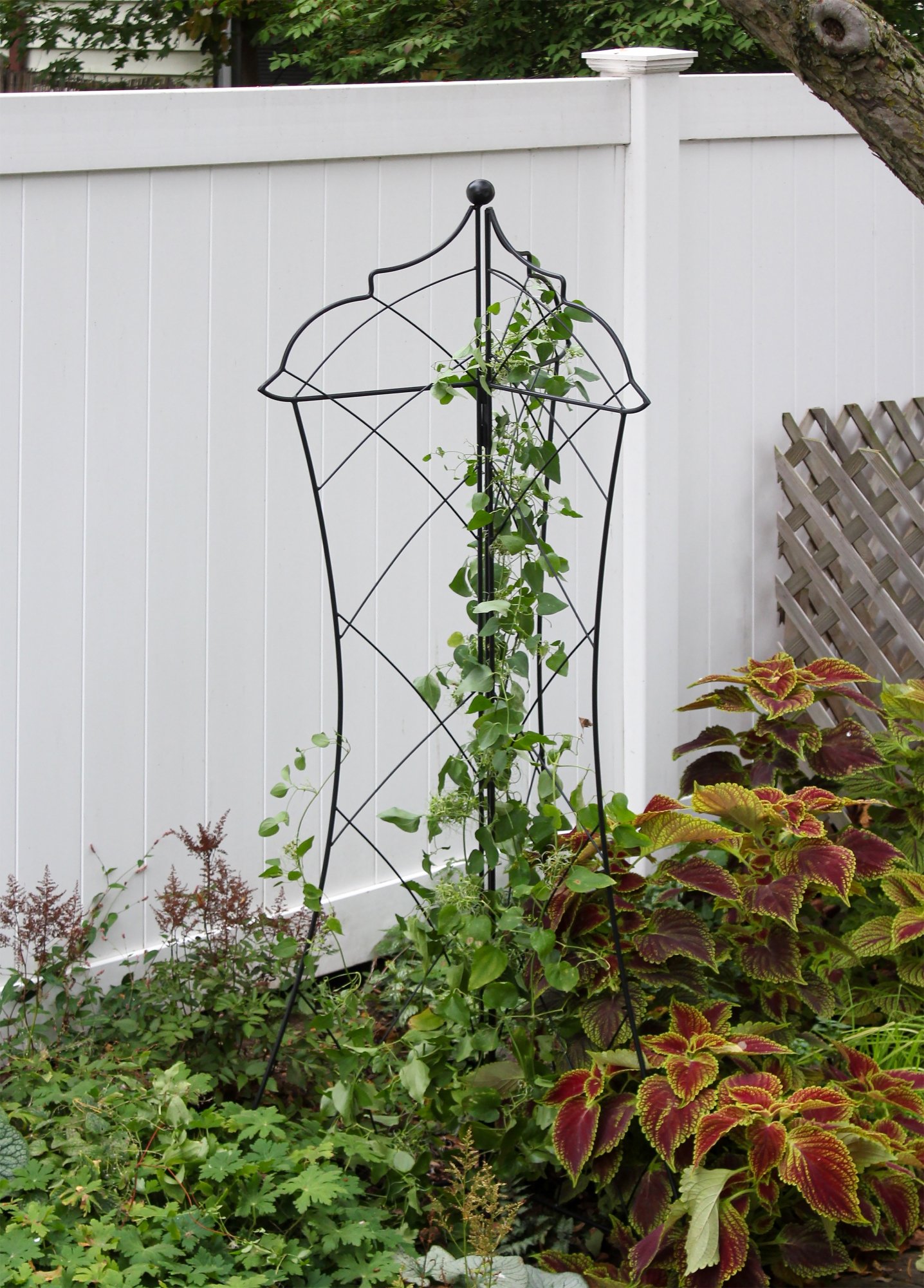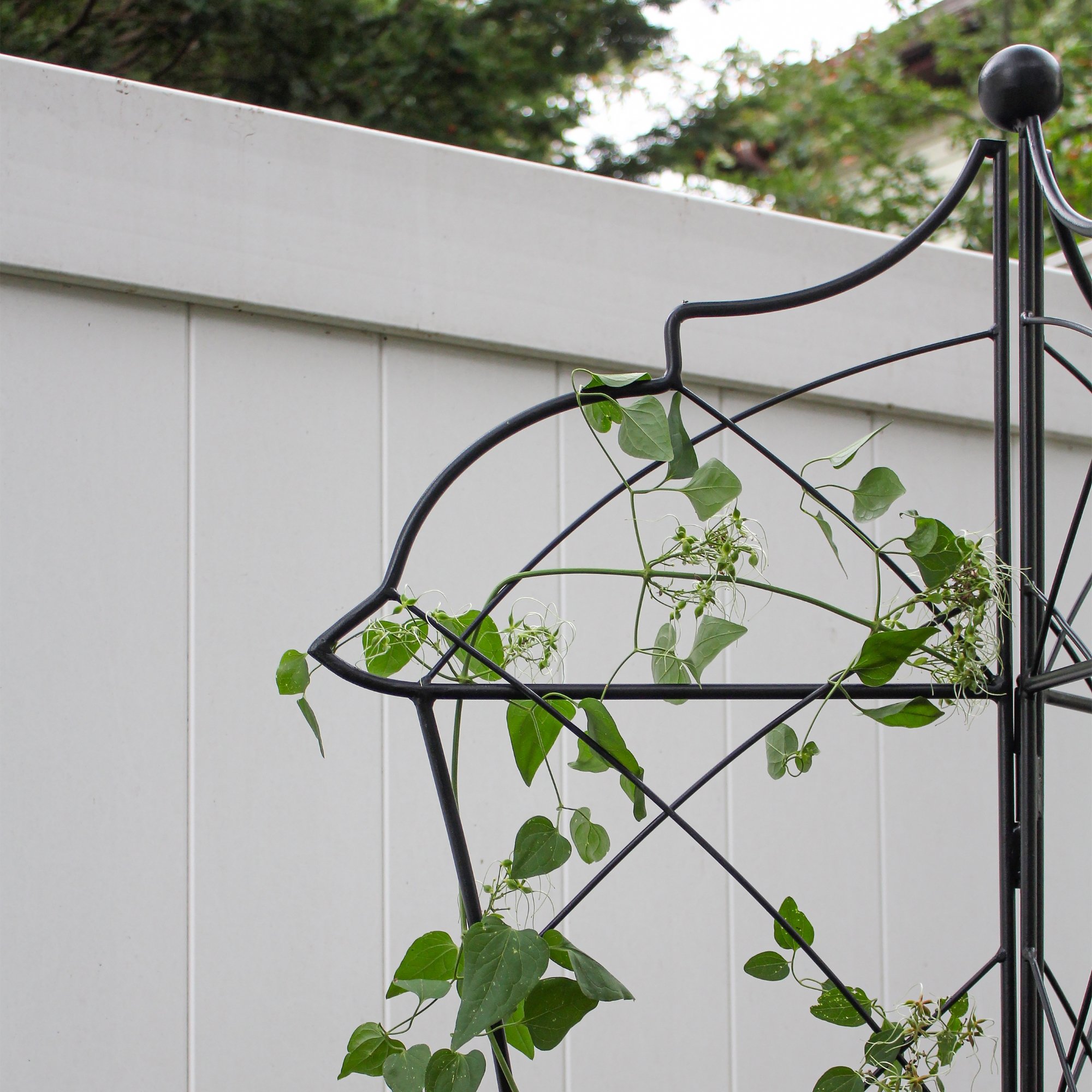Use the statuesque proportions of the Chess Queen Trellis make a statement piece for the garden, planted with climbing roses, honeysuckle or clematis. Three-bladed design for multi-side growing, makes this piece an ideal decorative garden centerpiece, for viewing from any direction. Though it is a large trellis, the open weave keeps it light and airy, and slip-together components make it simple to erect with no need for tools. The Black powder coated finish offers maximum protection against outdoor conditions.