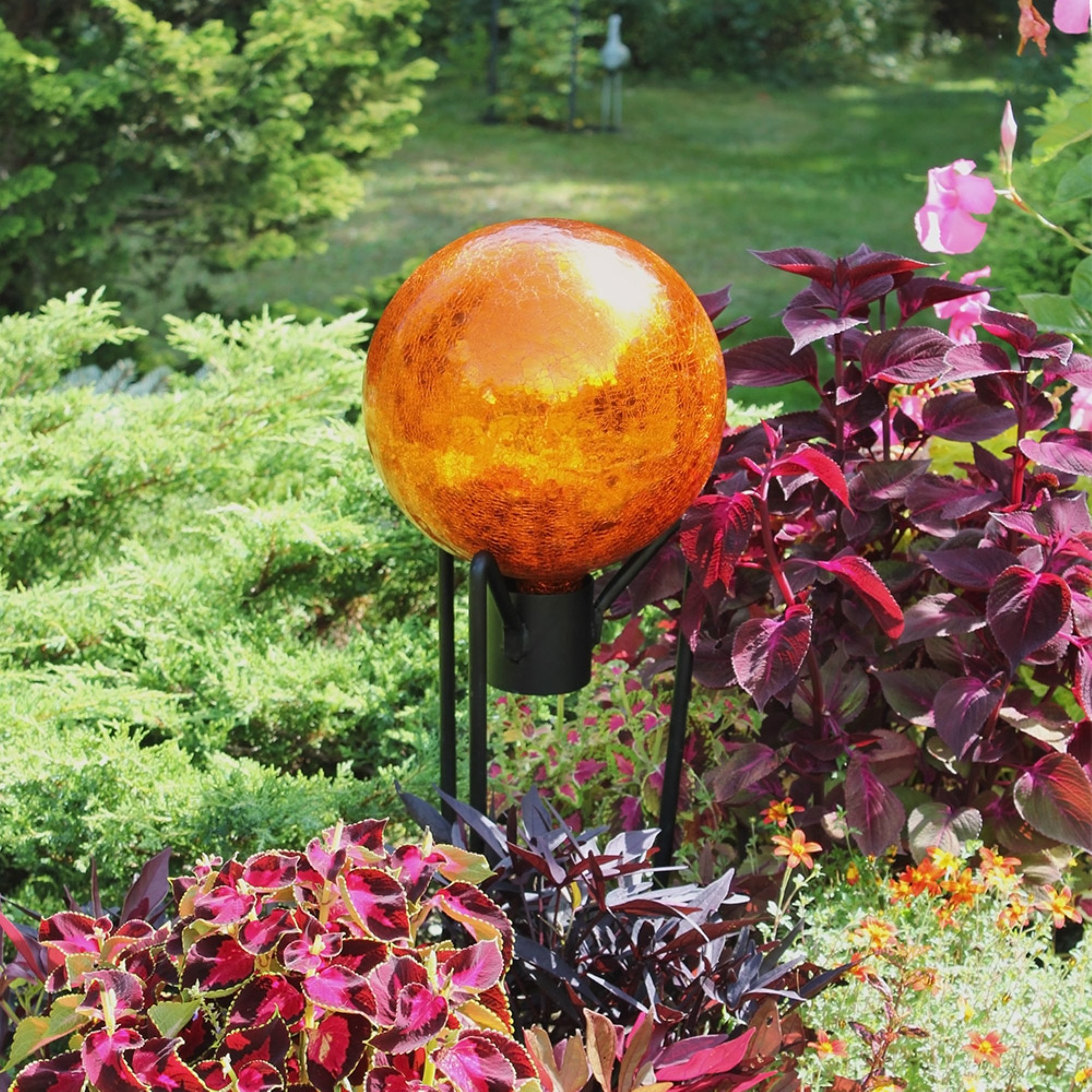 Named “spheres of light” by Antonio Neri in 1612, the first gazing globes date back to 13th century Venice. Popularized in the Victorian era, the mirrored finish provided a fish-eye view of the entire garden and they were believed to fend off misfortune and deliver happiness and joy. Add color, charm, and good luck to your garden with these sparkling garden jewels from ACHLA Designs. These glass balls are blown in a layered technique that gives a crackly appearance over the colored glass and mirror finish while retaining structural integrity. In 11 brilliant colors that will not fade with the sun, and three diameter sizes, 6” 10” and 12”. All Crackle Glass Gazing Globes have a stem that allows them to sit securely in any of our gazing globe stands. Our wrought iron Gazing Globe Stands come in a wide array of sizes and styles for hard surfaces and spiking directly into lawn and garden beds.