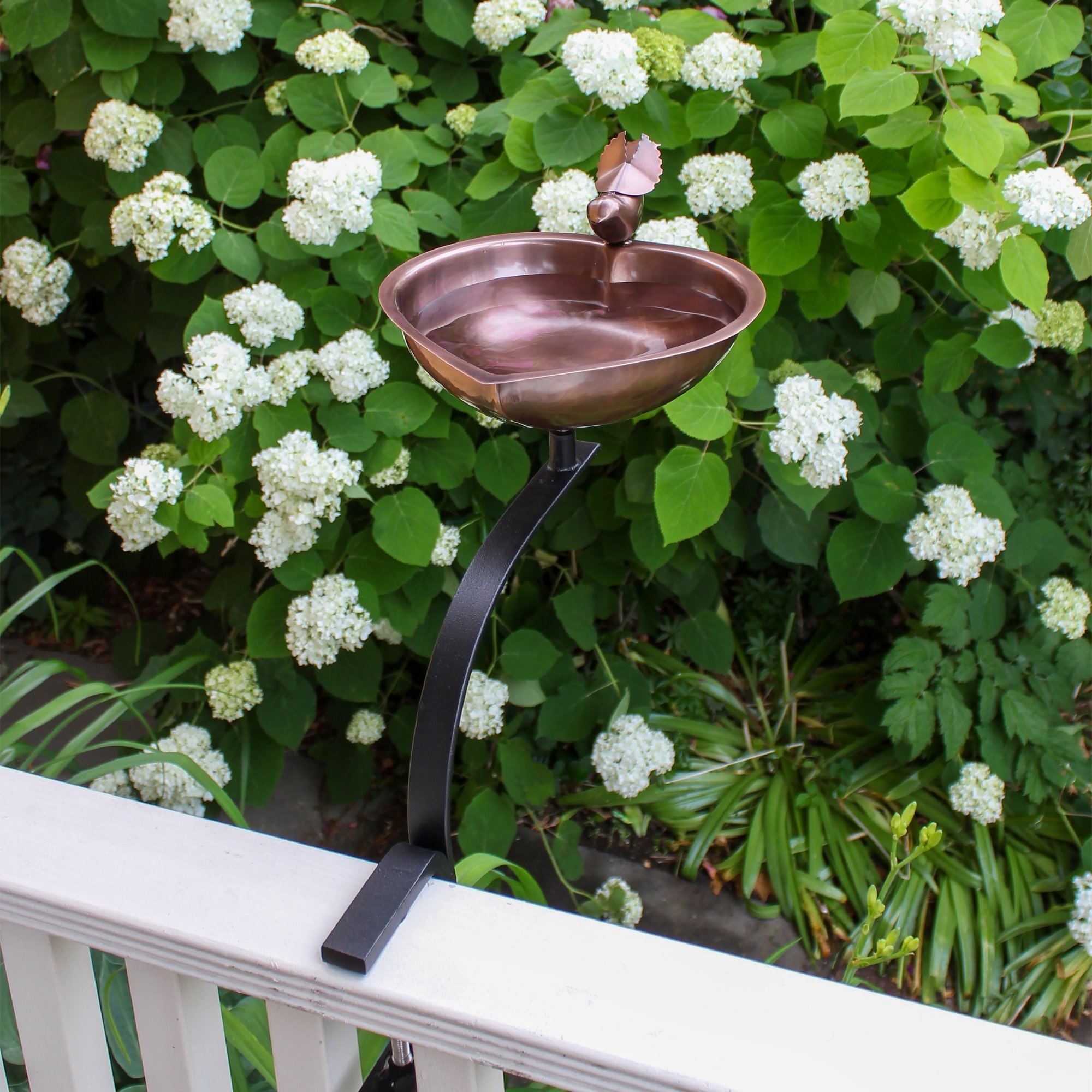 A simple bird detail perches on top of this sweet copper Rail-Mounted Heart Shaped Birdbath. This copper birdbath has a threaded base that fits onto the wrought iron bracket. Perfect for porch, balcony or deck handrails, the wrought iron bracket has C-type clamp that holds the bracket to the railing with the need for tools or permanent attachment. Ideal for your bird-loving or gardening sweetheart, this birdbath makes a perfect copper anniversary gift.