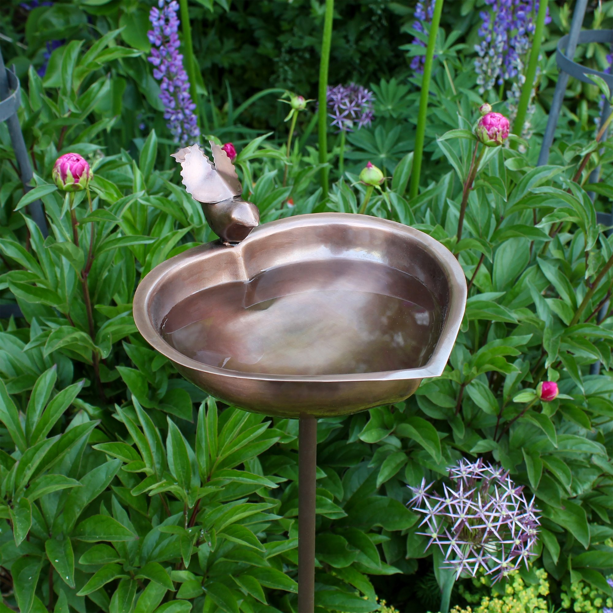 A lovely garden accent adds depth, dimension, and a focal point to a perennial bed, water feature or other natural setting. The Heart Shaped Birdbath and Feeder from Achla Designs is a beautiful garden decoration designed to benefit the wildlife in your yard. Birds will love having a safe place to cool off and drink some water, and gardeners will love having this piece to complement the plantings. A threaded base on the underside of the bowl attaches the bowl to the wrought iron garden Stake. A beautiful accent for any garden bed or border, the two pronged staked can be pushed right into any garden or lawn area. Ideal for your bird-loving or gardening sweetheart, this birdbath makes a perfect copper anniversary gift too!