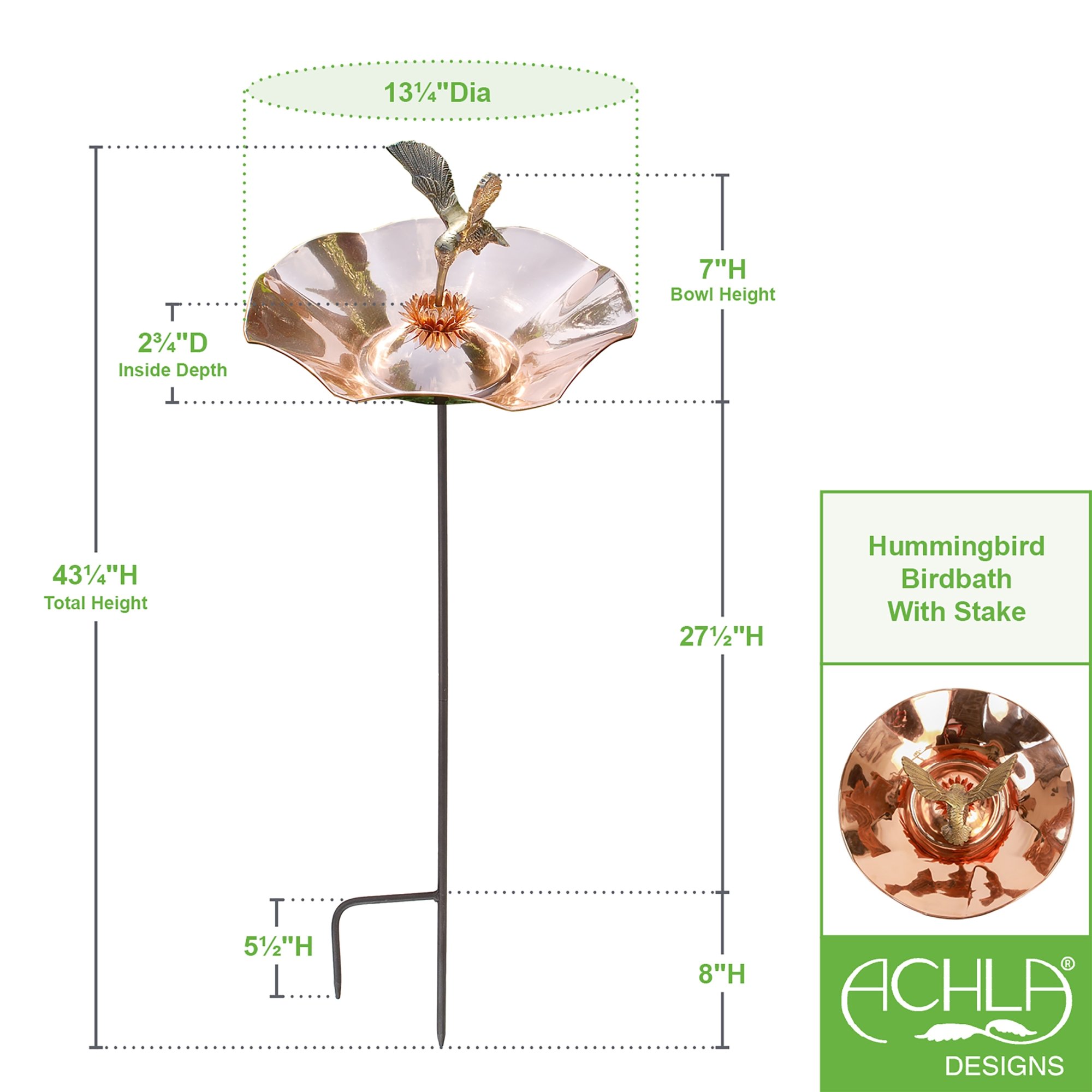 A lovely garden accent adds depth, dimension, and a focal point to a perennial bed, water feature or other natural setting. The Hummingbird Birdbath and Feeder from Achla Designs is a beautiful garden decoration designed to benefit the wildlife in your yard. Birds will love having a safe place to cool off and drink some water, and gardeners will love having this piece to complement the plantings. One of our most popular designs, this unique birdbath has a beautiful hummingbird hovering over the blossom at its center. The smooth undulating rim of polished copper is in soft contrast to the detailed casting and a threaded base on the underside of the bowl attaches the bowl to the wrought iron garden Stake. Ideal for your bird-loving or gardening sweetheart, this birdbath makes a perfect copper anniversary gift.