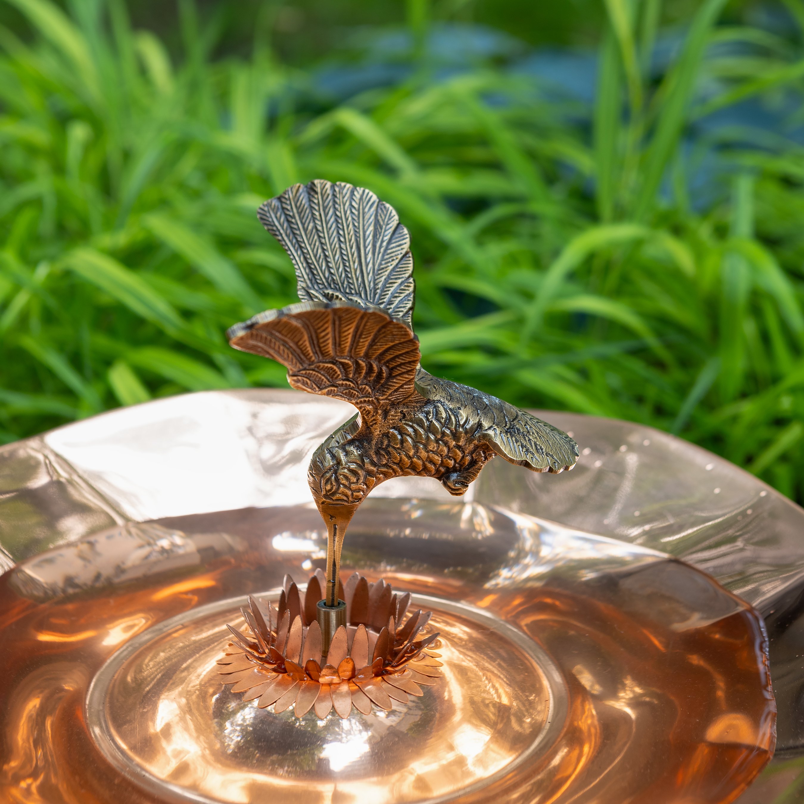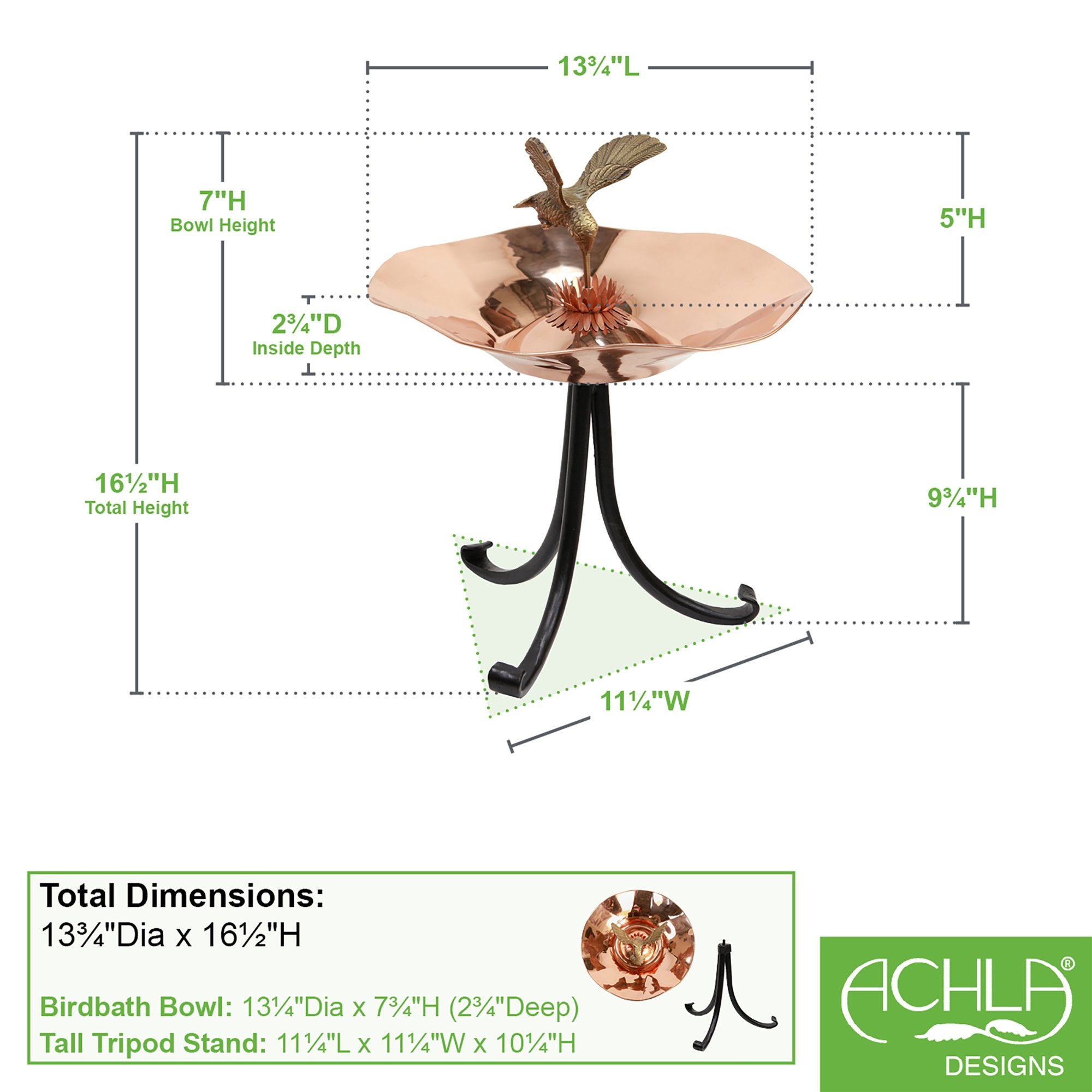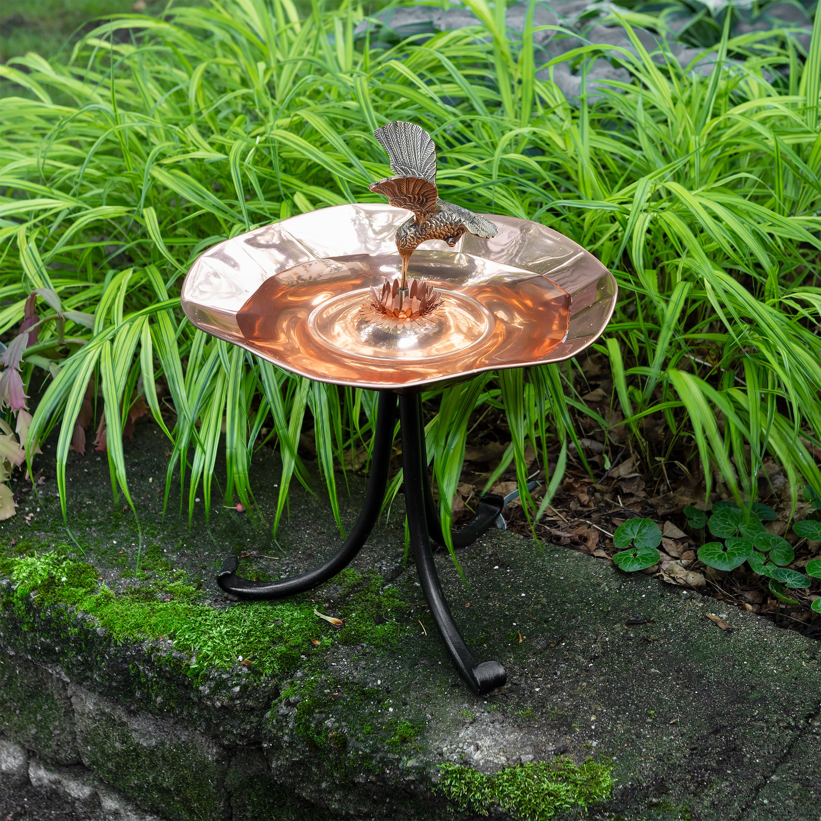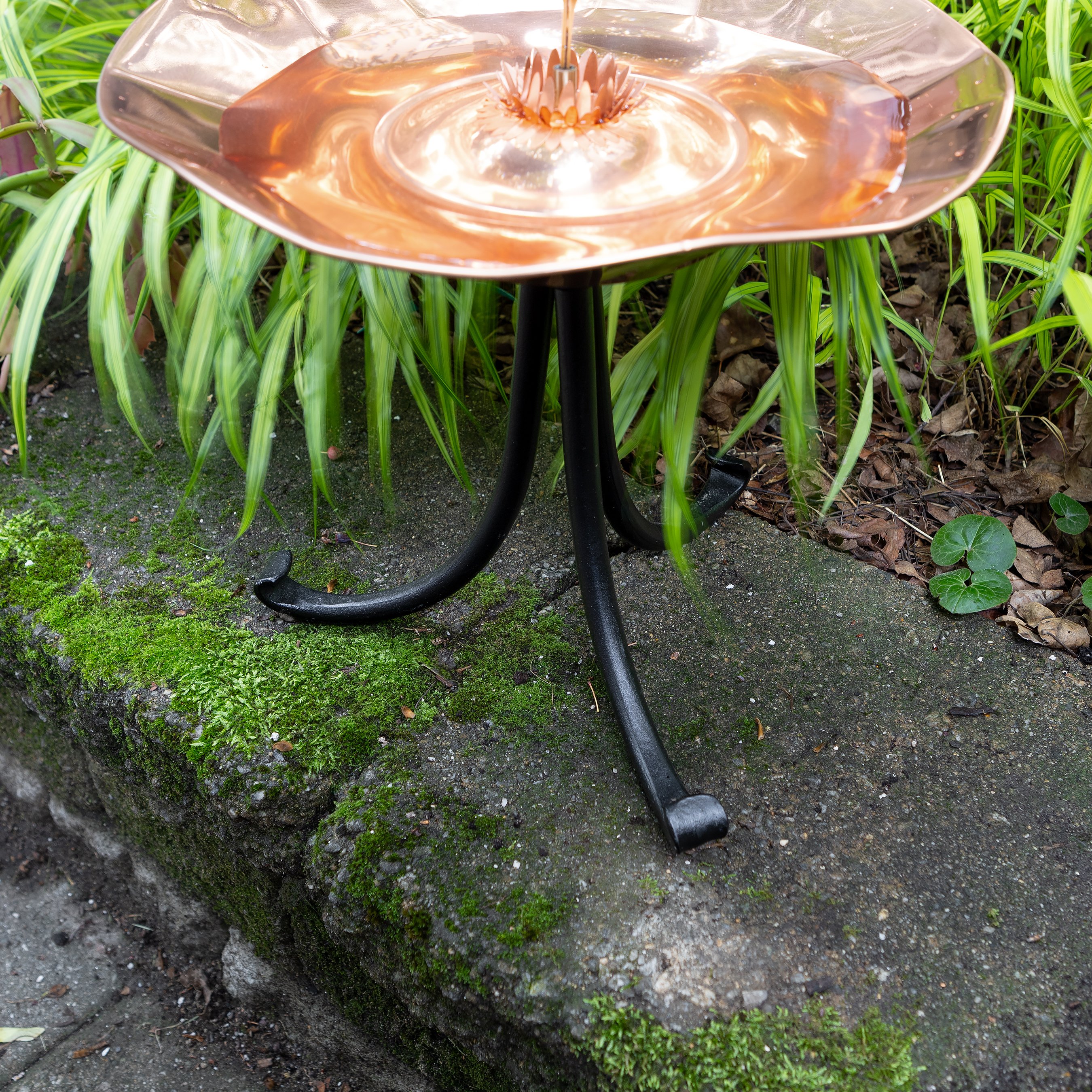 The Tripod Hummingbird Birdbath features a soft undulating flower-shaped bowl. Formed from brass with a copper plating that will not rust, it will develop a lovely natural copper patina with time. A solid brass sculpted hummingbird reaches for nectar into the raised central blossom, making this birdbath an eye-catching art piece in any garden. The threaded base on the underside of the bowl attaches to a low tripod that can be placed on a deck or tabletop, or a pedestal. An ideal gift for your bird-loving or gardening sweetheart, this small three-footed wrought iron stand is perfect height for rock gardens, tabletops, and low border plantings.