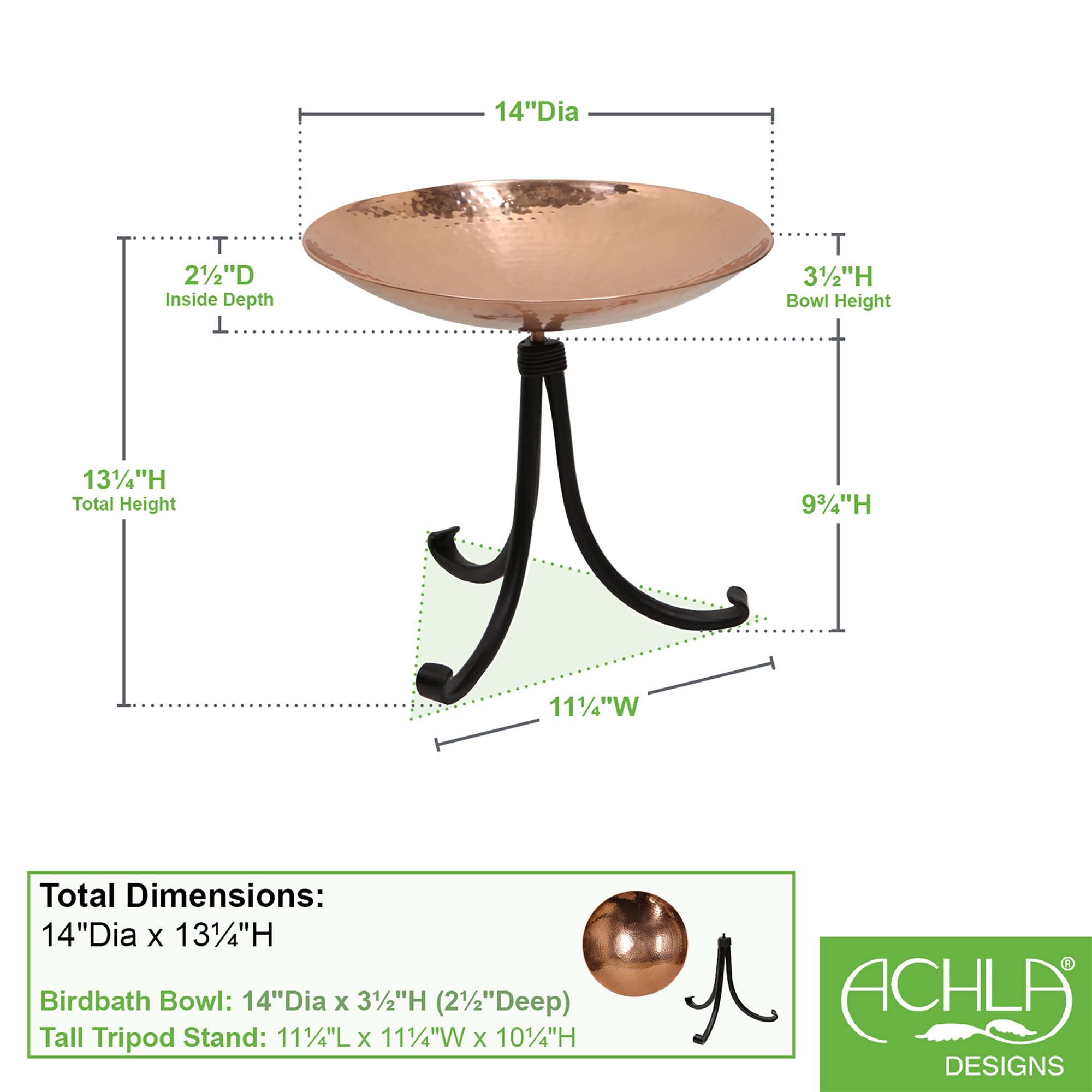 This Tripod Polished Copper Birdbath is a simple hammered copper birdbath bowl with a small wrought iron Tripod Stand. The shallow bowl has a round hammered or "peened" texture and a shiny copper finish that will patina naturally. The threaded base on the underside of the bowl attaches to a small three-footed wrought iron stand. This birdbath makes a beautiful garden accent piece placed on a deck, tabletop, or pedestal. This is a perfect choice for rock gardens, tabletops, and low border plantings too.