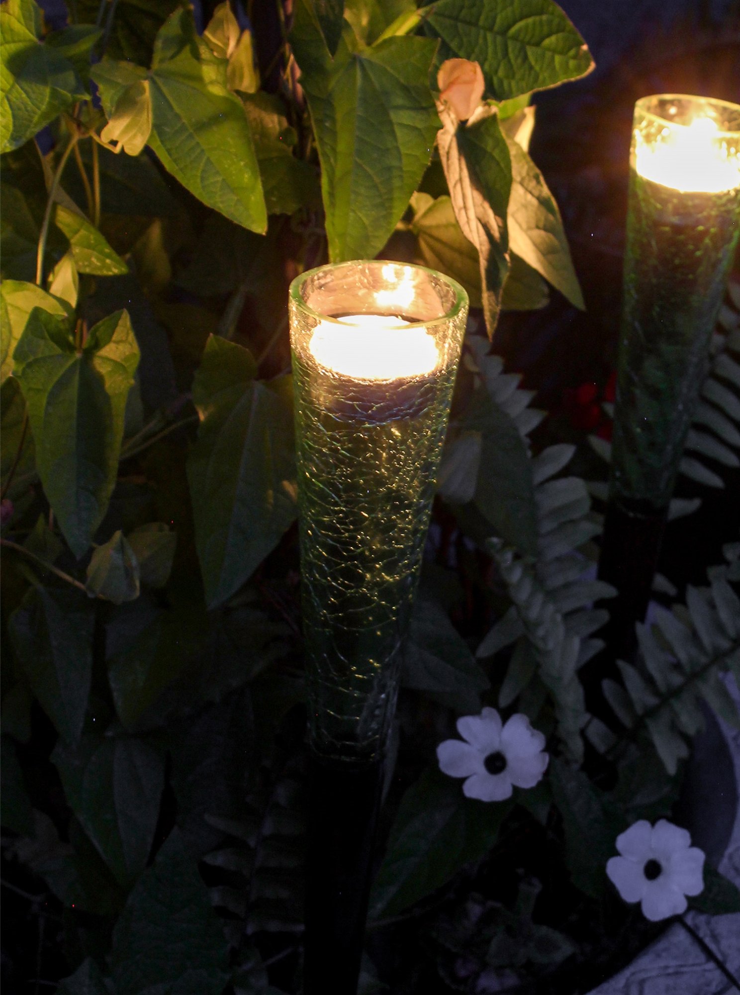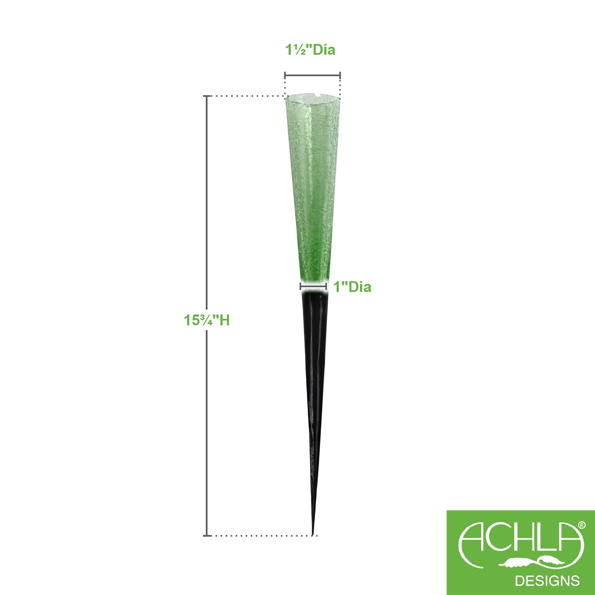 The crackled glass of the Sparkle Cones brings a festive colorful twinkle to your garden or patio party. Cones hold LED or traditional tea lights. Metal portion can be spiked directly into beds or planters and also make a lovely addition to window boxes and container gardens, table centerpieces and event arrangements. Available in six brilliant colors and sold in sets of six of one color, or a multi-color set containing one of each.