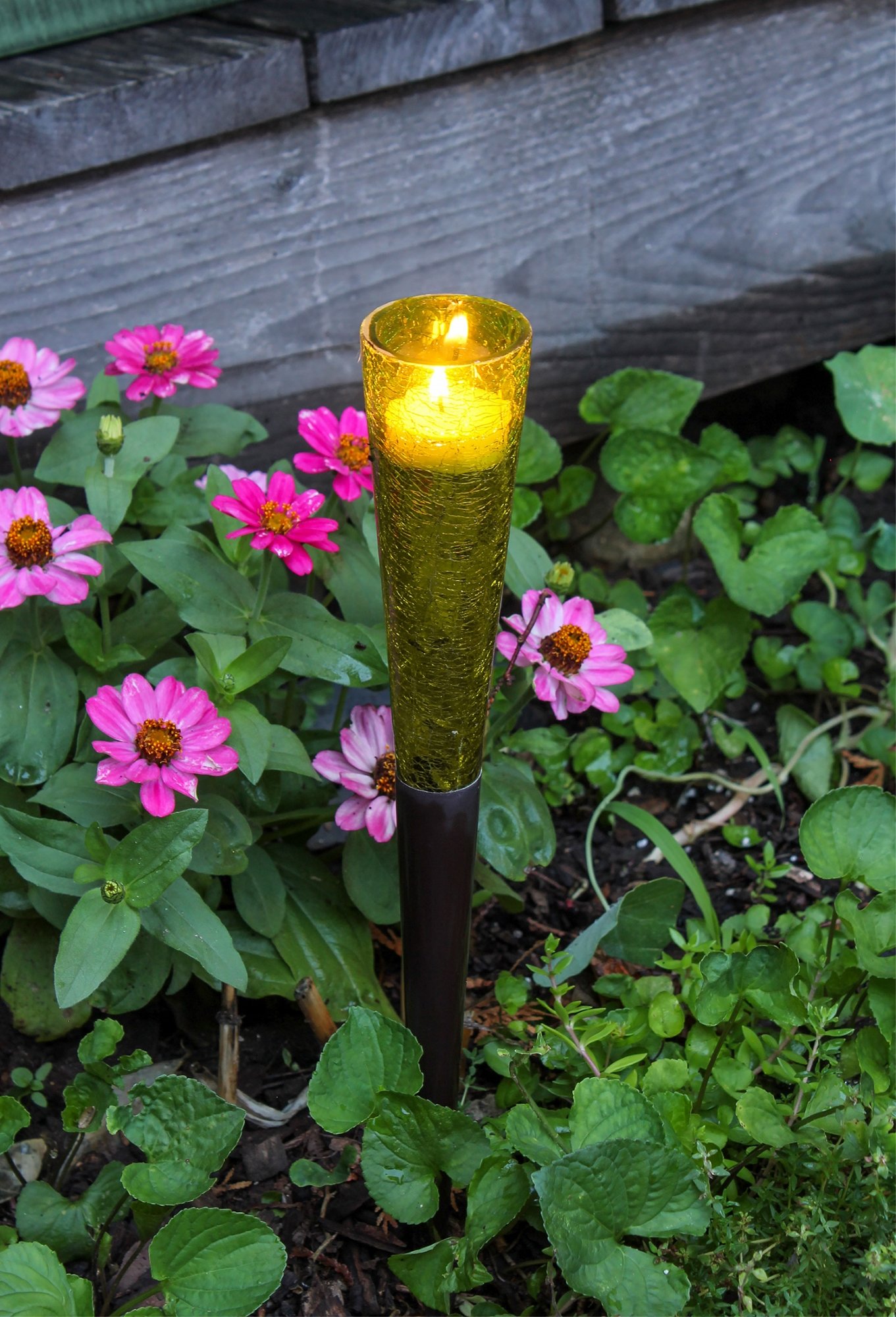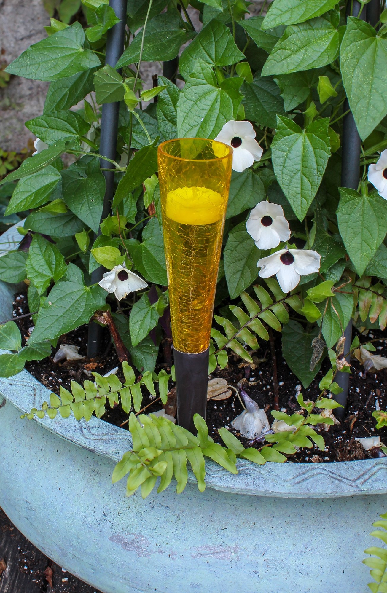 The crackled glass of the Sparkle Cones brings a festive colorful twinkle to your garden or patio party. Cones hold LED or traditional tea lights. Metal portion can be spiked directly into beds or planters and also make a lovely addition to window boxes and container gardens, table centerpieces and event arrangements. Available in six brilliant colors and sold in sets of six of one color, or a multi-color set containing one of each.