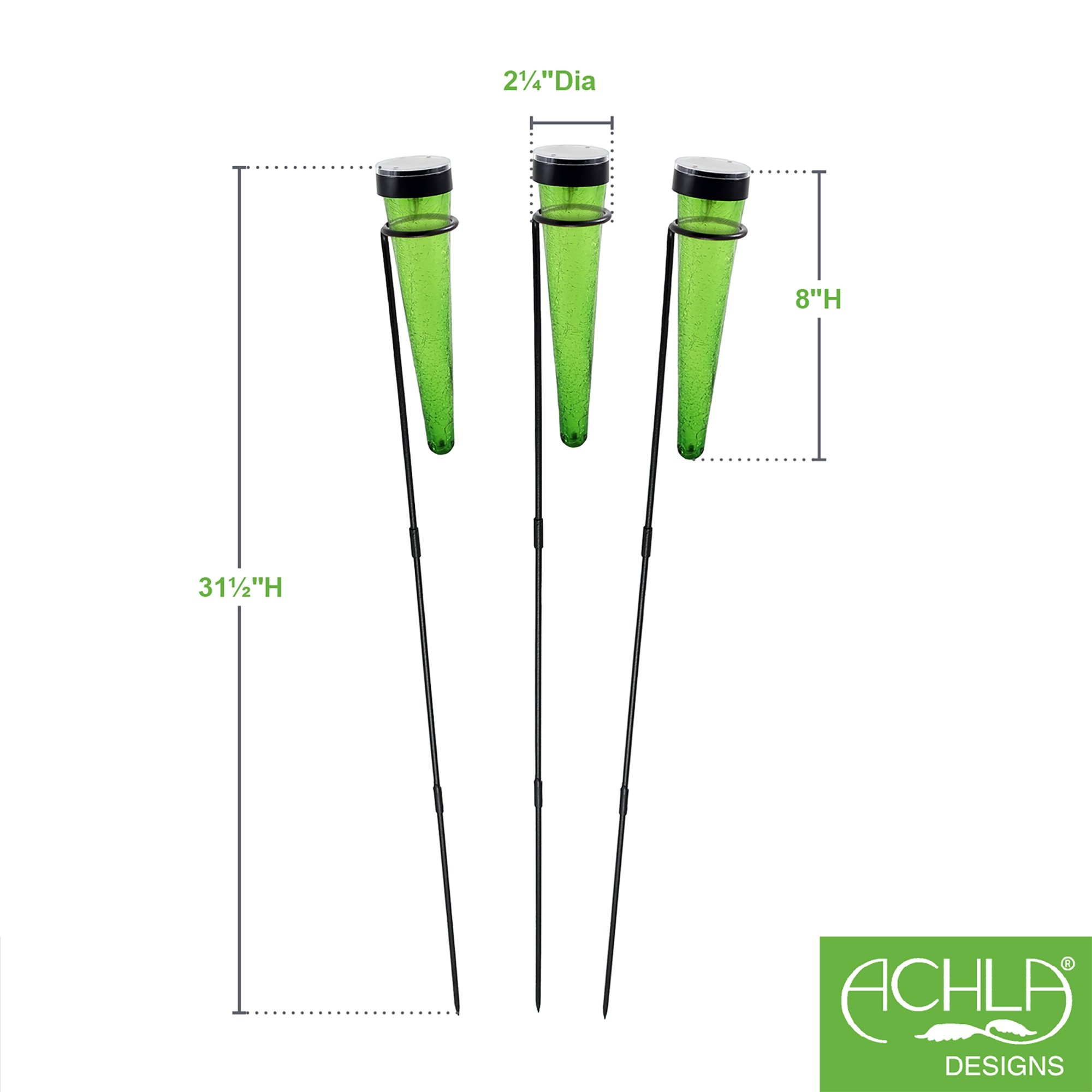 Our ever-popular Achla Designs Solar Sparkle Cones have been adapted for garden stakes. Made of colorful hand-blown glass, we use a layered glassmaking technique that gives the glass a crackled effect. As the solar-powered LED light shines shine through the hand-blown, colored glass, a beautiful glow is created, adding a magical ambiance to your yard, garden, or patio. Each glass cone is topped with a solar cap that containing a panel that charges the battery with sunlight. At dusk, the light sensor turns on the LED within. Light up paths and walkways, garden beds, and patio borders- stake into the ground in any other area of the yard with landscape lighting that needs no wires or cords. Sold in sets of three colored crackle glass cones with solar caps and three wrought iron garden stakes, Sparkle Cone Stakes are available in six colors: dark blue, dark green, emerald green, light blue, red, and yellow. Great outdoor lighting lets you enjoy spending time outside, even after the sun goes down.