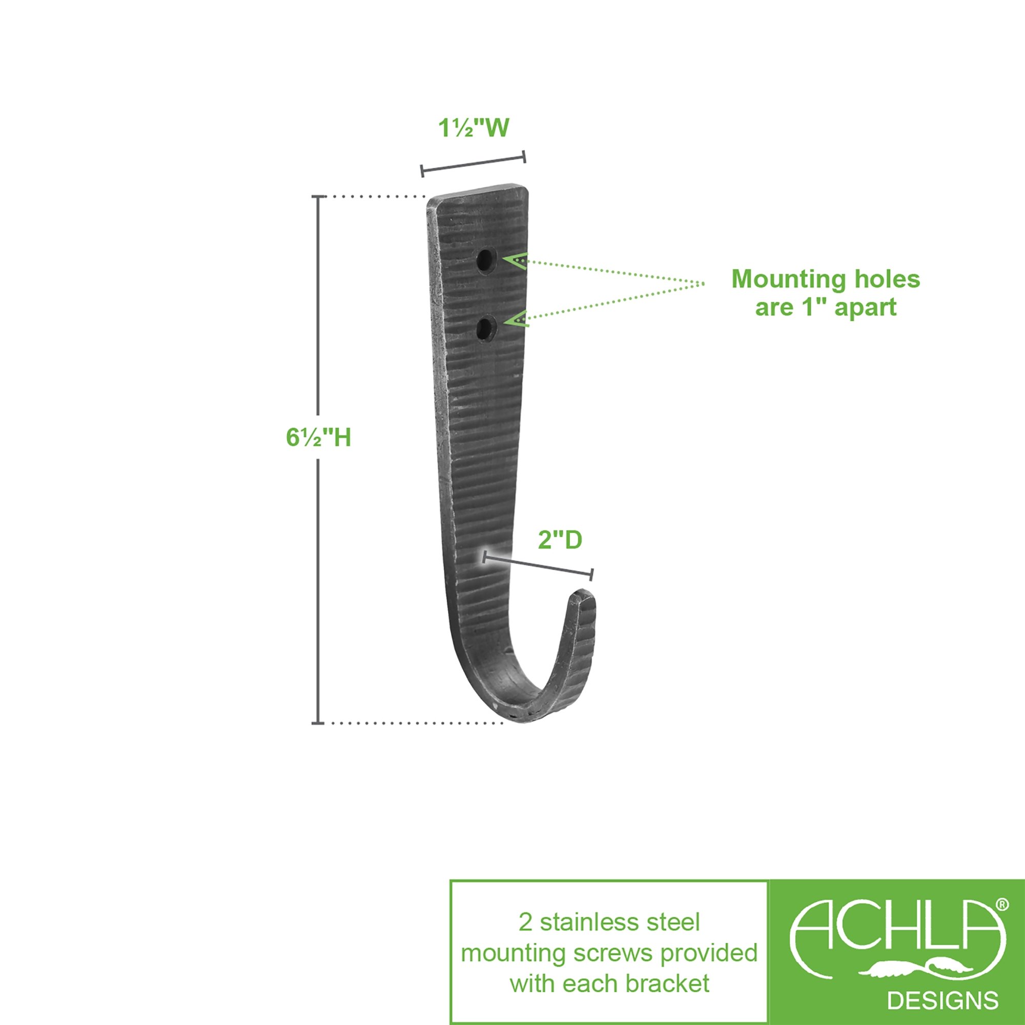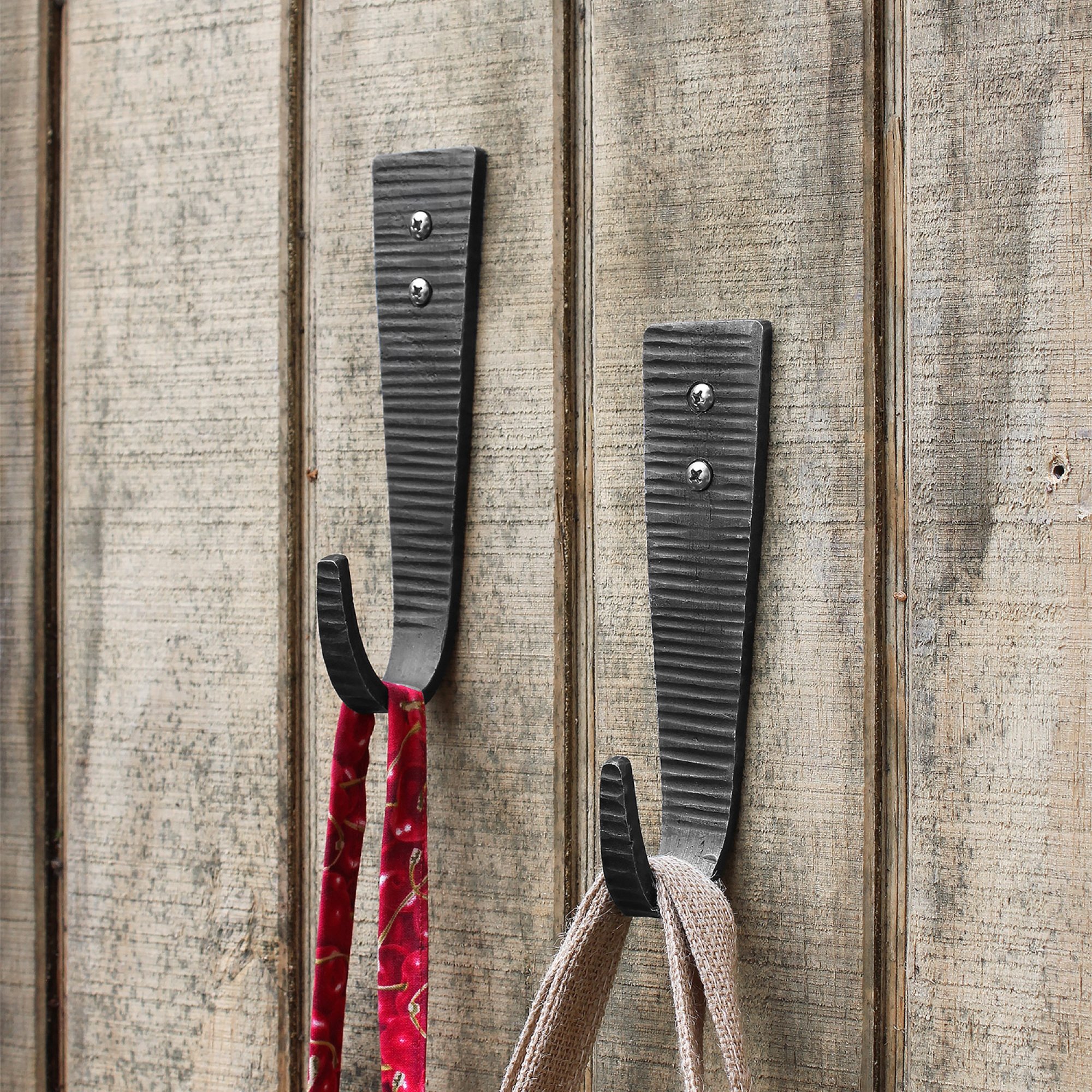 These Hammered Strap J-Hooks , are simple upturned wall hooks with a hammered with a cross-peen texture. These stout hooks are perfect for hanging anywhere to keep tools, aprons, towels, bags, organized and handy, from the kitchen to the mudroom, fireplace to shed. Handcrafted from wrought iron with a zinc plated finish for a vintage look. Each comes with a stainless steel screw for attaching to a wall or post.