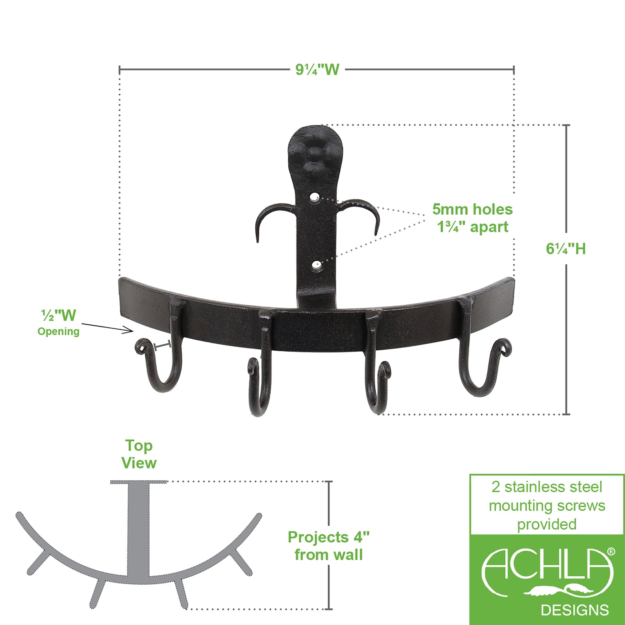 These multi hook wall brackets are great for keeping garden tools handy and dry, but you can find a multitude of other uses to reduce clutter in the kitchen, basement hall or pantry. Use them to store brooms, mugs, kitchen utensils, aprons, shopping bags, your grubby gardening togs and more! Available in compact four-hook, and longer, five-hook options. Made with traditional wrought iron techniques, the narrow hooks have curled tips and a pressed flower design tops the mounting plate.