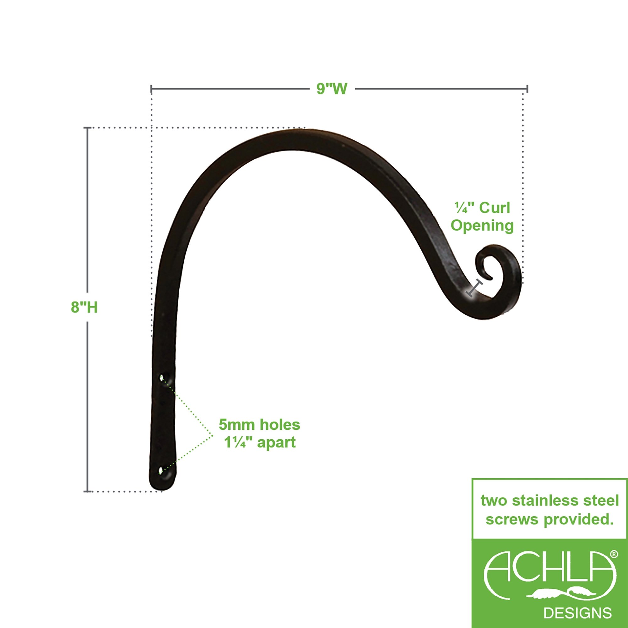 For strong, multi-use wall mounted hooks, the Achla Designs Wall Brackets and Hooks come in a wide array of shapes and sizes for hanging your favorite indoor and outdoor items- lanterns, wind chimes, bird feeders, flower baskets or planters. Hand-forged from square stock in wrought iron, the hammered look has a craftsman style that fits with a vintage, rustic, or artisan decorative style. These hooks are easily installed on any flat smooth surface with stainless steel hardware provided. Strong and durable, you can rest assured that your hanging hooks will stay looking elegant because the Black powder coated finish resists corrosion and weathering better than most conventional paint finishes, lasting many seasons. Achla Designs offers a wide array of brackets in many sizes and styles for every application. Sold in pairs.