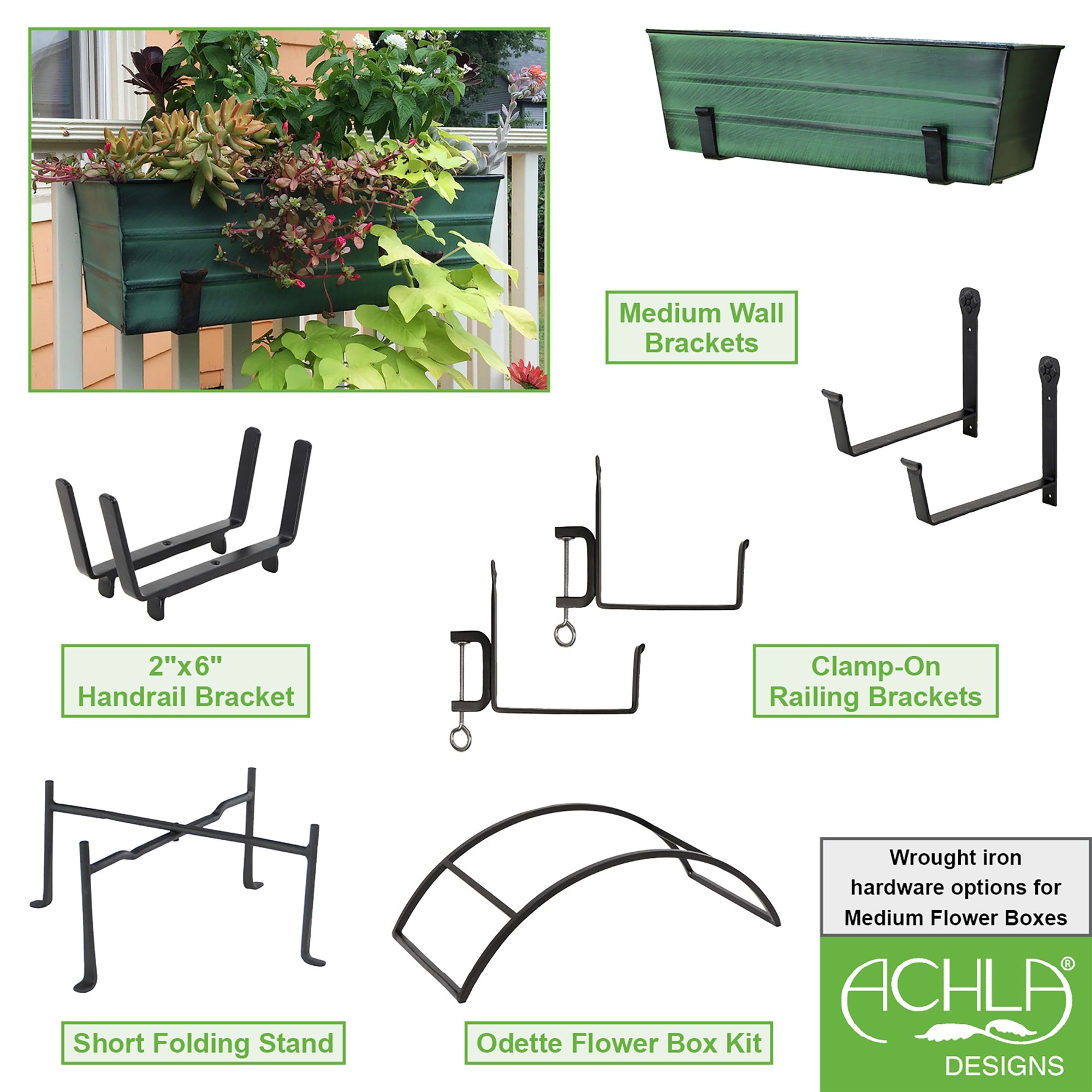 Add curb appeal to a front porch, create a container garden, or decorate with seasonal plantings on a balcony or deck. This Medium Green Flower Box Kit with Wall Brackets has two wall-mounted brackets that simply and securely hold our Medium Green Galvanized Flower Box planter. The sturdy brackets are made from wrought iron with a durable Black powder coated Finish. For easy installation, place the two wall brackets at the desired width apart and secure with stainless steel screws provided. Fill the box with favorite plants and place within the brackets. Kits are available in all four Flower Box colors, in three sizes, or with top-mounted Railing Brackets.