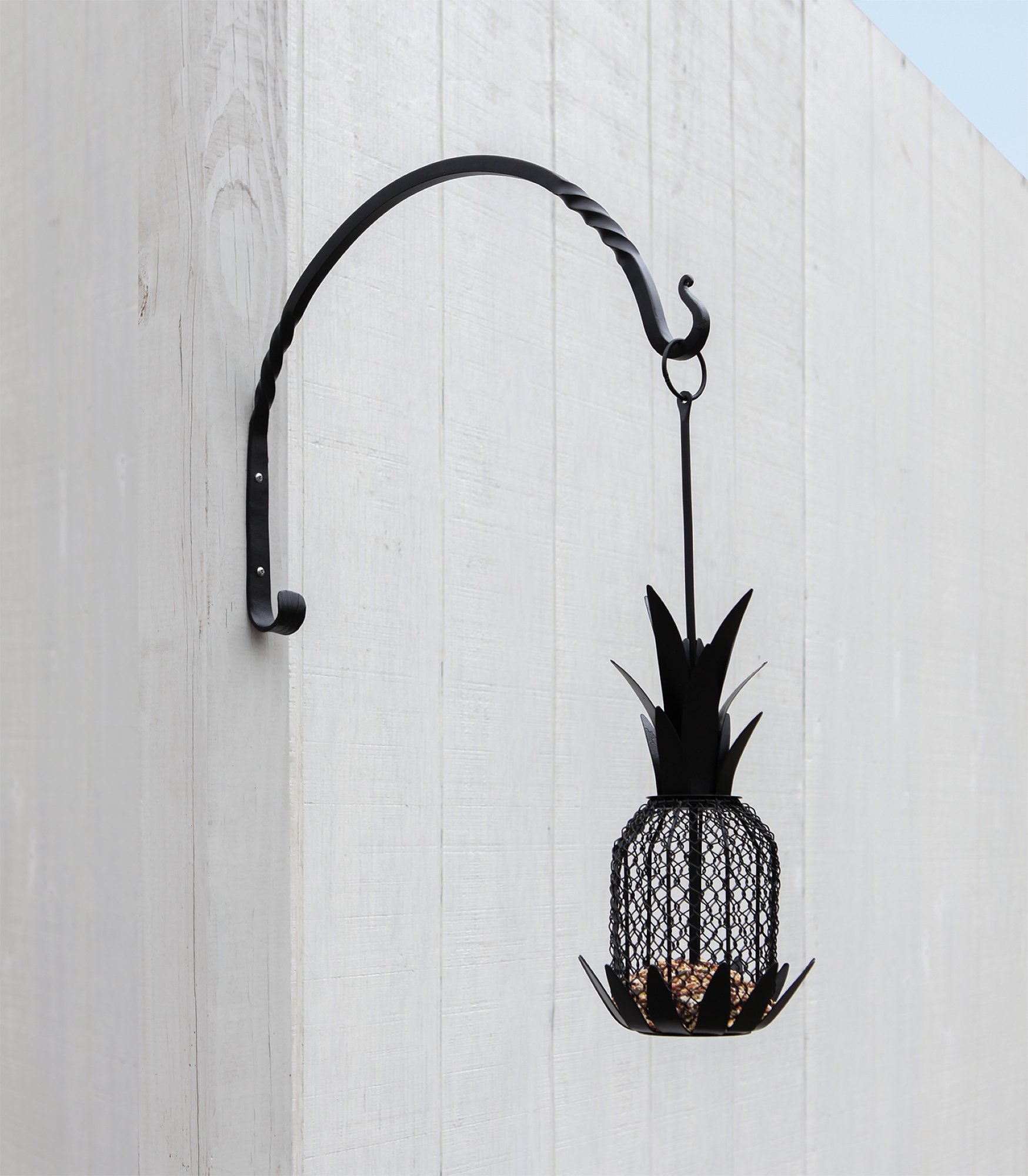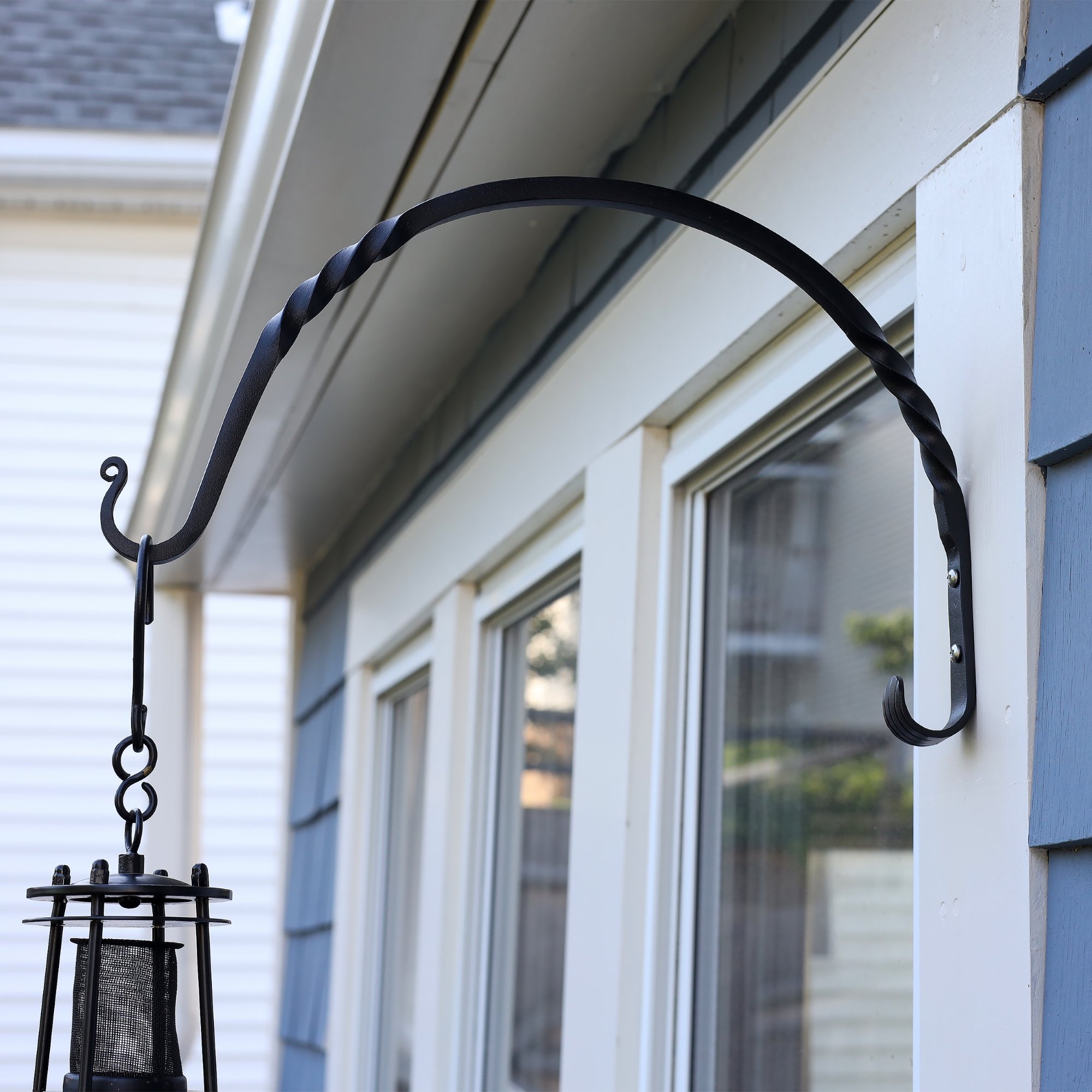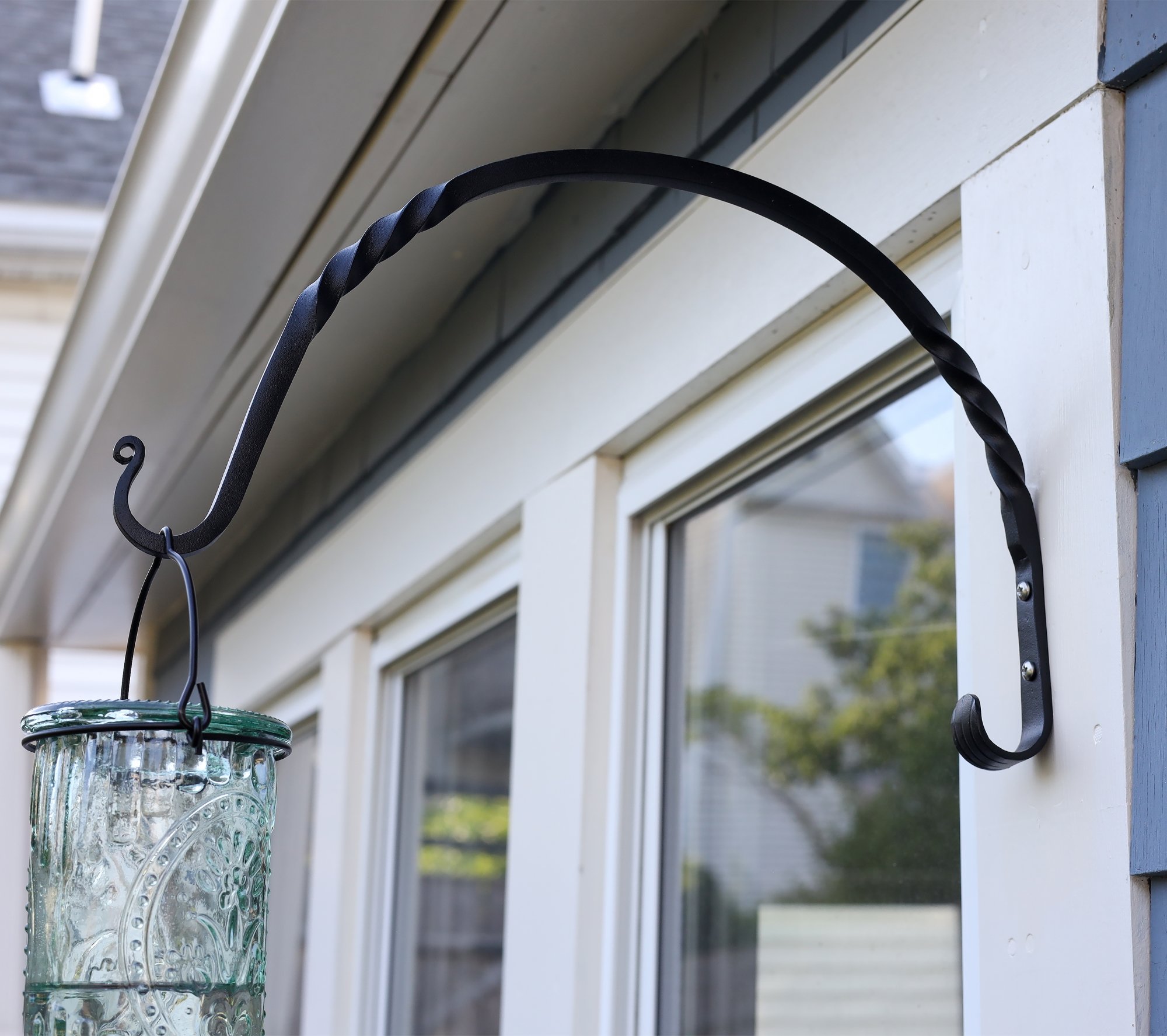 The Heavy Duty Arc Bracket has a beautifully detailed hook in a traditional wrought-iron style. This sturdy hook is made of square stock and has two sets of twists with a curled hook end. The bracket arches far enough to hold a larger birdfeeder or heavy basket securely. Available in two sizes and sold in a pack of two.