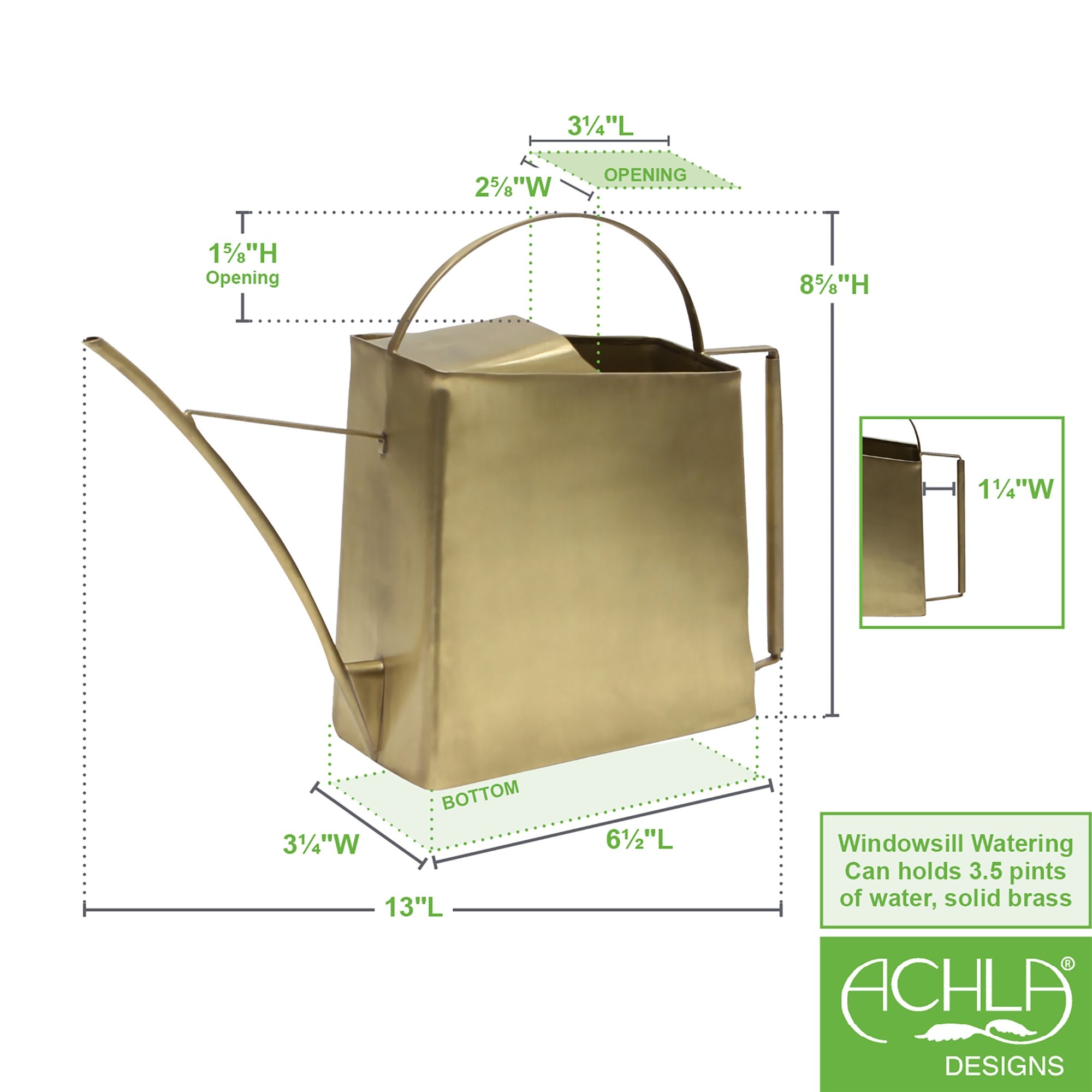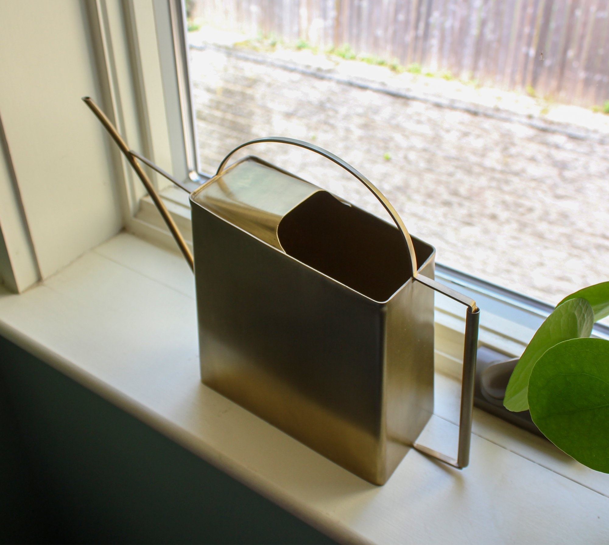 The Windowsill Watering Can has a stylish narrow profile and a long curved spout that easily reaches beneath leaves to deliver water directly to the soil surface. The elegant design makes an attractive addition to any plant collection and the slim shape fits easily on a plant shelf or sill. Made of solid brass, with a brushed finish, this fine quality item will serve your small houseplants for many years.