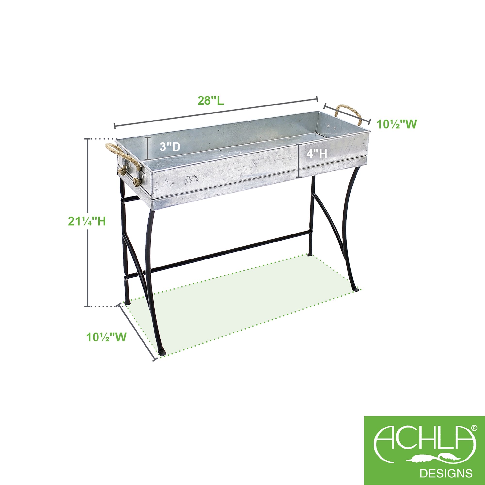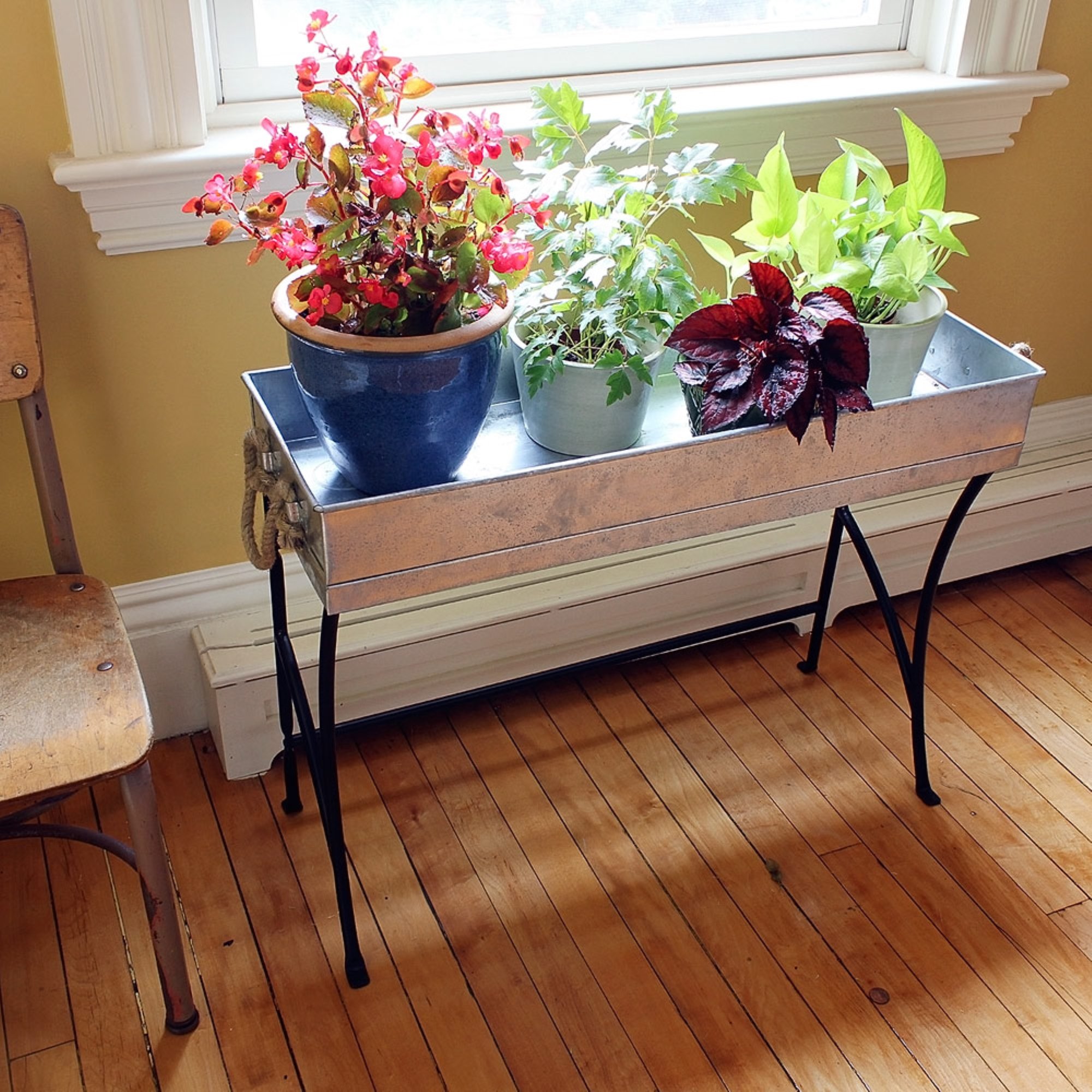 Create a stylish grouping with a collection of succulent, violet, or orchid plants that will enhance your contemporary home décor with our Trestle Plant Stands. The wrought iron bases are designed to butt against a wall, with the galvanized tray fitting snugly on top. The tall sides of the tray will prevent plants from sliding off, while containing soil and water mess. When it's time to bring plants in at the end of the season, the Trestle Plant Stands are ideal for keeping plants healthy indoors during colder months, holding containers at windowsill height. Trestle stands in two heights can be paired for a stepped arrangement that is perfect for taking advantage of a sunny window. Rope handles allow you to easily lift and move the tray from the stand to bring tender plants indoors on a chilly night, or seedlings from windowsill to natural light. See our full line of Achla Designs plant stands for every patio, porch, terrace, deck or balcony container garden, to fit every style of home and garden décor.