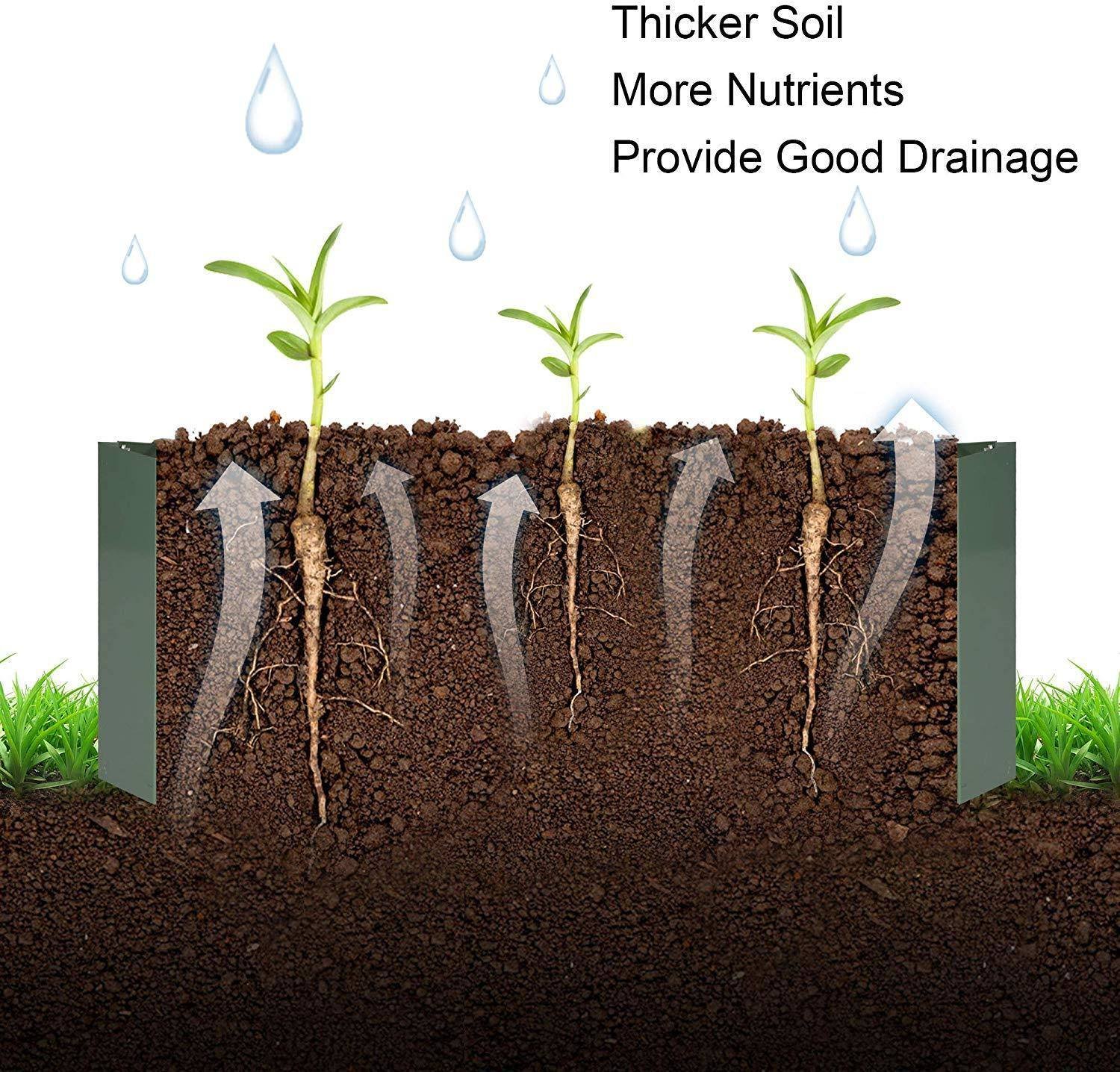 Fabulous Planter Box: 48" x 36" x 12" square galvanized raised garden bed provides good drainage, keeps weeds out of the soil, repels insects and protects your plants; you can use this great gardening tool in your Grow your favorite plants on the patio.Made of Galvanized Steel: Anti-rust Safe Material; No Contamination to Soil, Safe for Plants and Humans; No Sharp Edges for Outdoor Bed Kits, Won't Hurt Your Fingers.The sheet metal is designed with a wavy structure for better compression resistance; thickened steel and reinforced corners can easily secure soil and plants.Just use screws to connect 4 parts, each part is clear at a glance; you can also invite your family to assemble this garden bed in minutes.The raised soil directly touches the ground, expelling excess water, protecting plant root health and allowing plant roots to grow freely.Specification:Color: Green