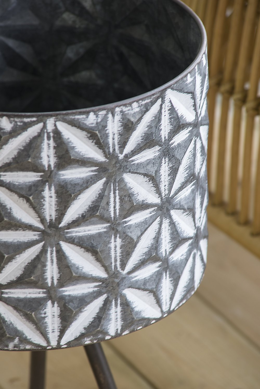 The DesignReminiscent of vintage aluminum tile ceilings, the Large Round Grey Planters on Tall Stands offer a unique garden accent that will add a splash of classic vintage style to your outdoor space. These planters combined with dark iron stands are perfect for outdoor use and will make a statement in your yard! The rustic style is perfect for any garden theme.