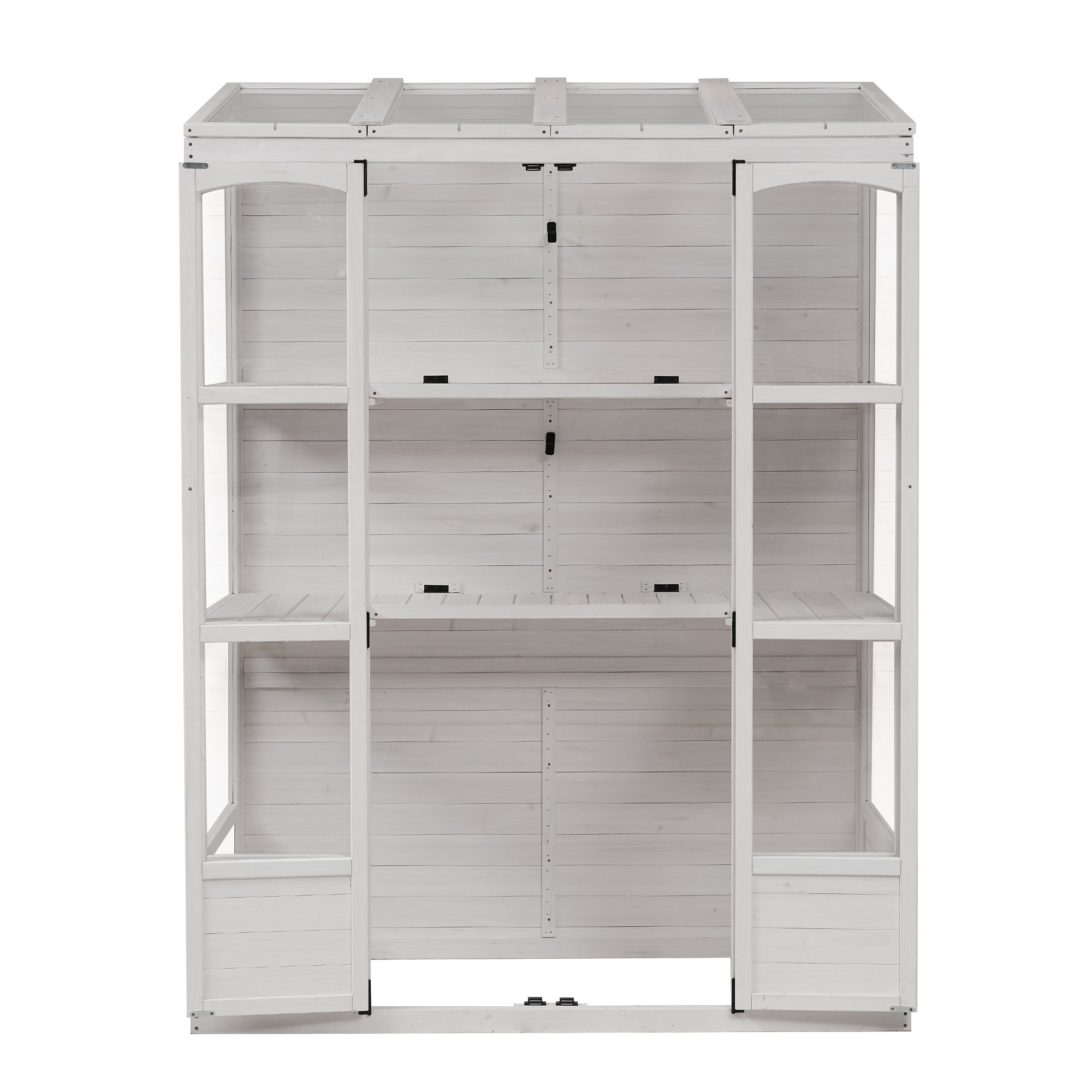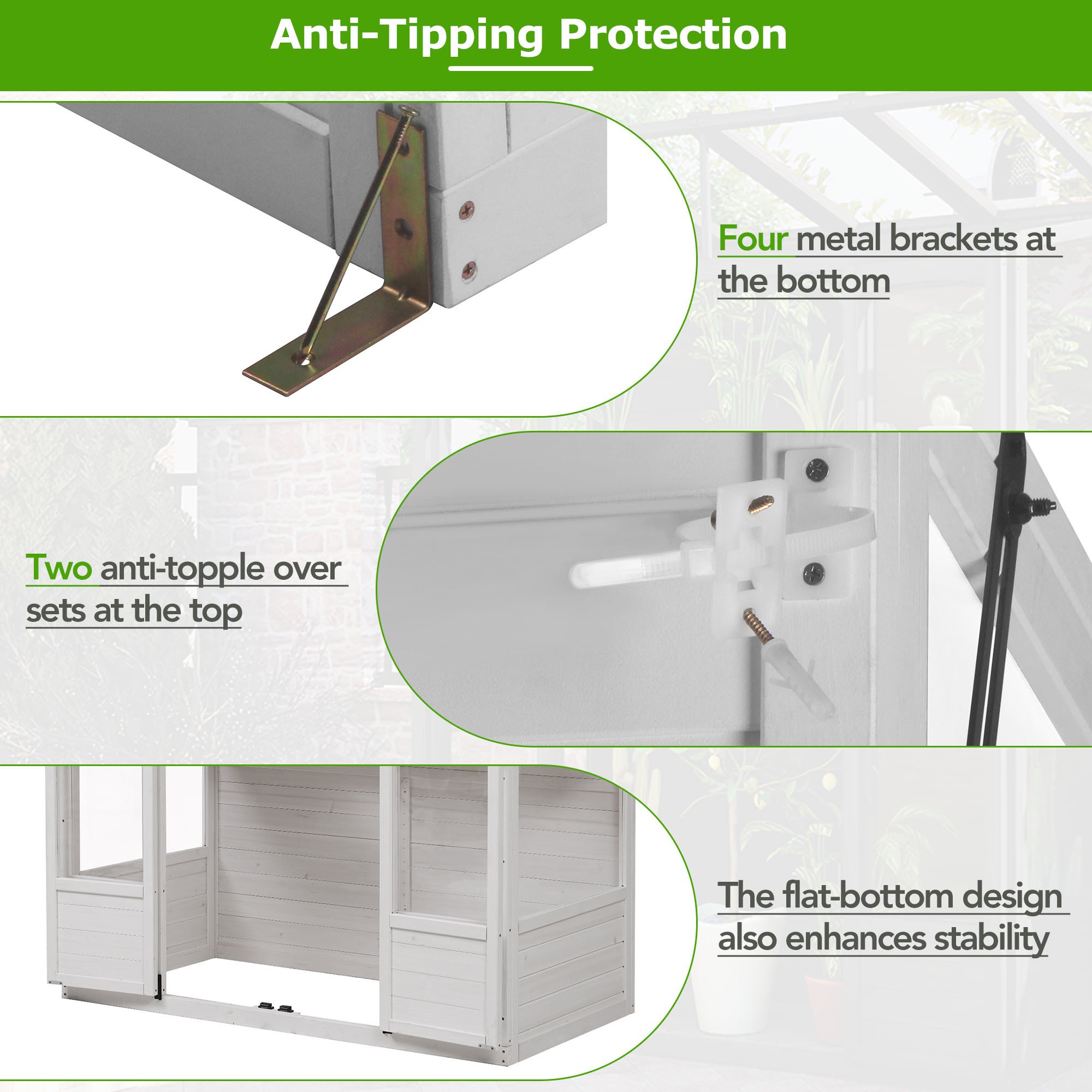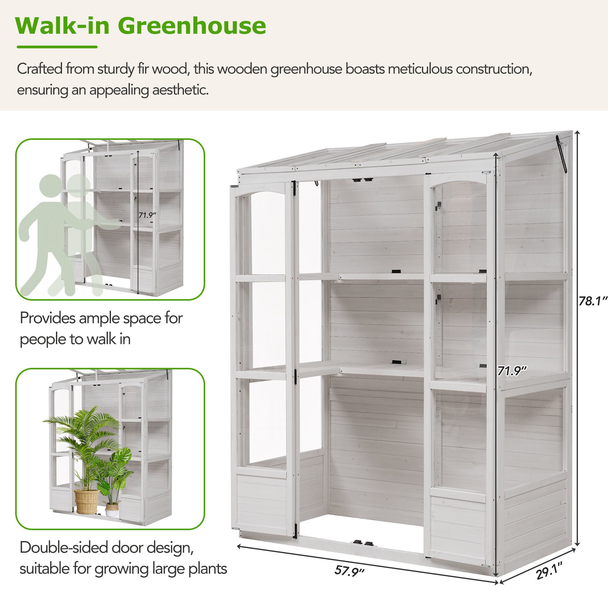 Anti-Fall ProtectionFour metal brackets at the bottom, coupled with two anti-topple over sets at the top, guarantee stability and top-to-bottom anti-risk capability. The flat-bottom design also enhances stability, eliminating unnecessary rocking.Highlights∑maryHighlightsMade from Fir Wood / 2 Folding Middle Shelves / 78-inch Height / Double-sided Door / 4 Skylights / Anti-fall Devices / Walk-in Greenhouse / Two Colors AvailableSummaryExperience the perfect fusion of form and function with this wooden greenhouse. Meticulously crafted from durable materials, it offers a spacious haven for a diverse range of plants. The thoughtfully designed two shelves provide ample storage, while the shelf heights could accommodate varying plants. Skylights and polycarbonate panels enhance light penetration, creating an ideal environment for plant growth. Double-sided door ensures easy access and the flat bottom design adds stability. This greenhouse seamlessly combines practicality and aesthetics, promising a delightful space for gardening enthusiasts to nurture green companions.