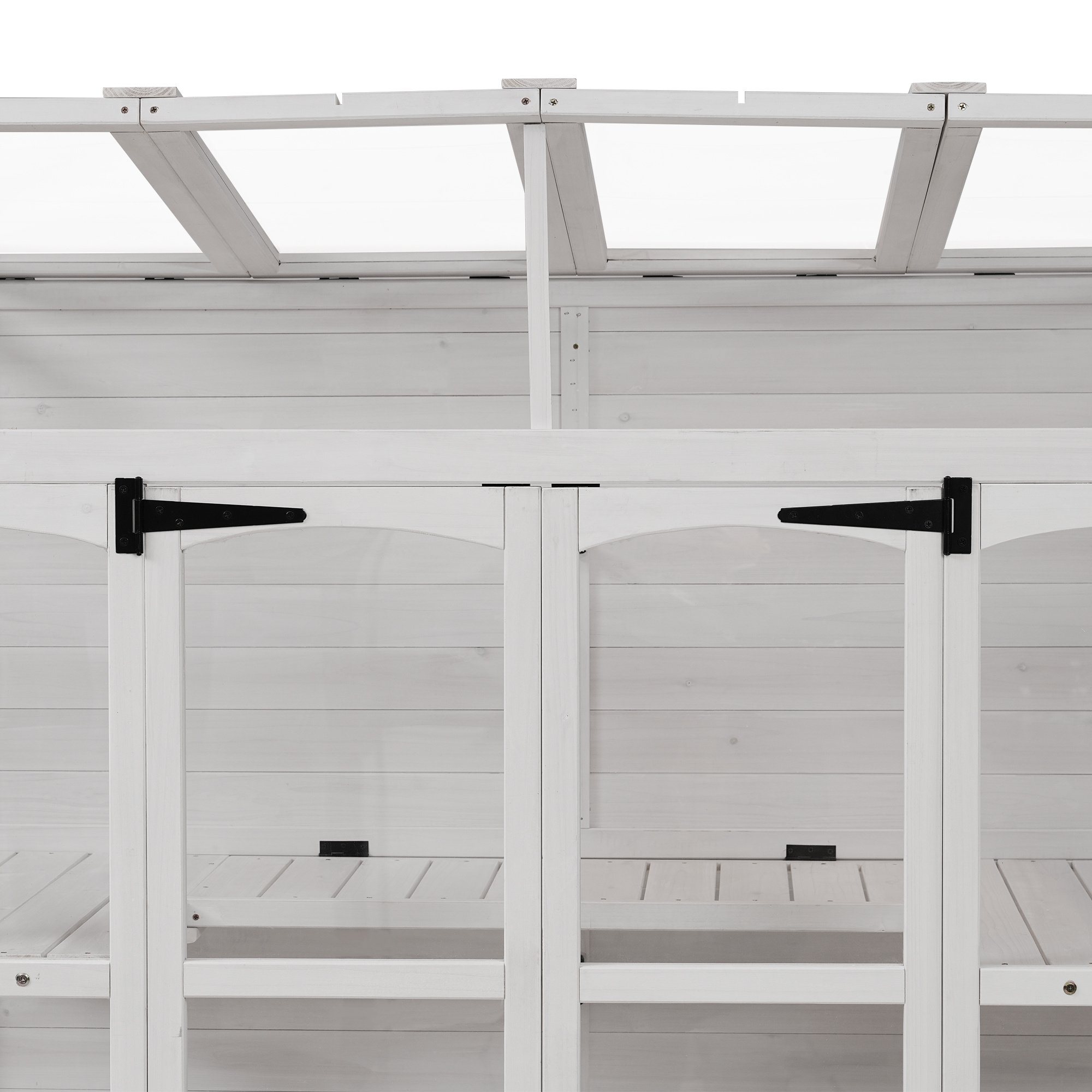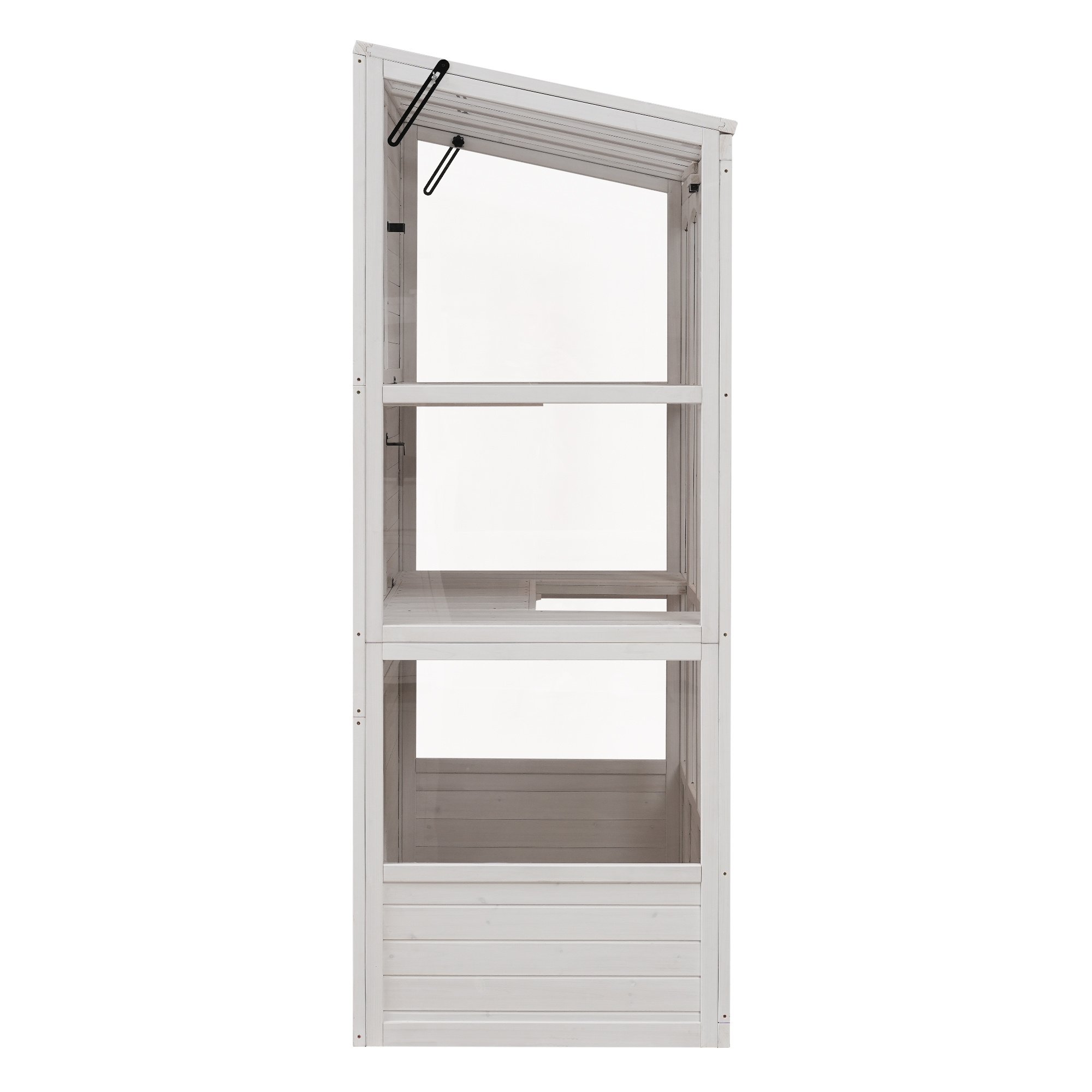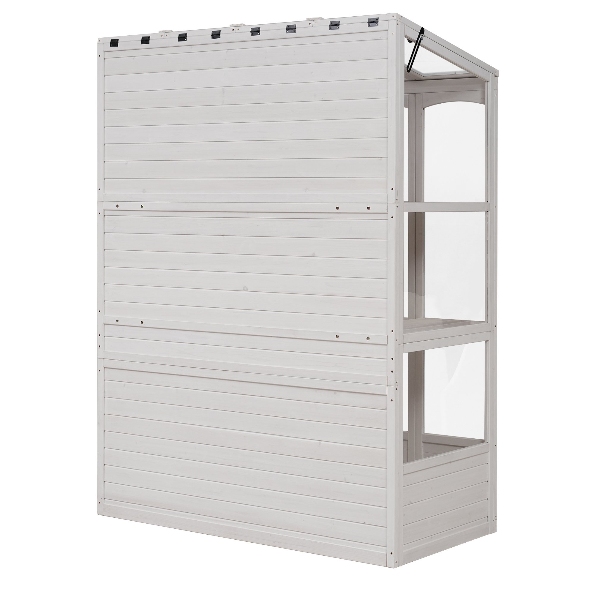 Anti-Fall ProtectionFour metal brackets at the bottom, coupled with two anti-topple over sets at the top, guarantee stability and top-to-bottom anti-risk capability. The flat-bottom design also enhances stability, eliminating unnecessary rocking.Highlights∑maryHighlightsMade from Fir Wood / 2 Folding Middle Shelves / 78-inch Height / Double-sided Door / 4 Skylights / Anti-fall Devices / Walk-in Greenhouse / Two Colors AvailableSummaryExperience the perfect fusion of form and function with this wooden greenhouse. Meticulously crafted from durable materials, it offers a spacious haven for a diverse range of plants. The thoughtfully designed two shelves provide ample storage, while the shelf heights could accommodate varying plants. Skylights and polycarbonate panels enhance light penetration, creating an ideal environment for plant growth. Double-sided door ensures easy access and the flat bottom design adds stability. This greenhouse seamlessly combines practicality and aesthetics, promising a delightful space for gardening enthusiasts to nurture green companions.